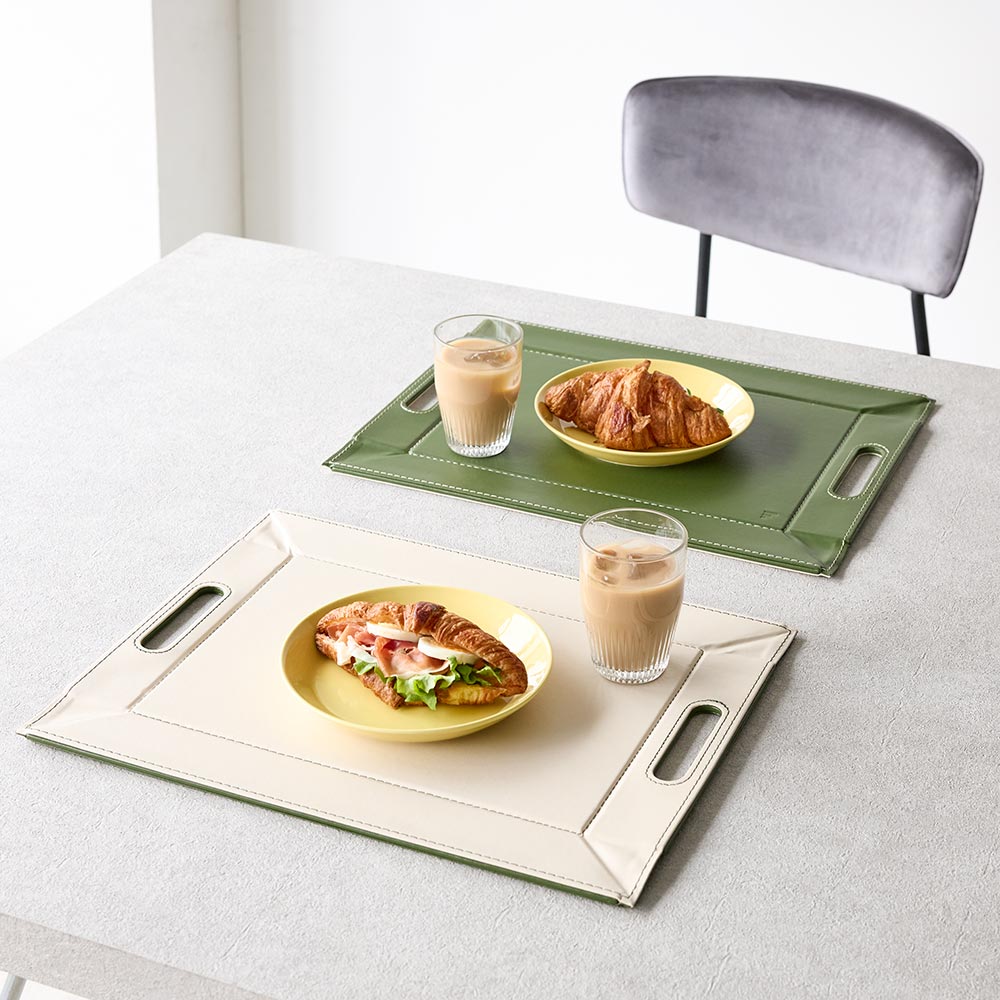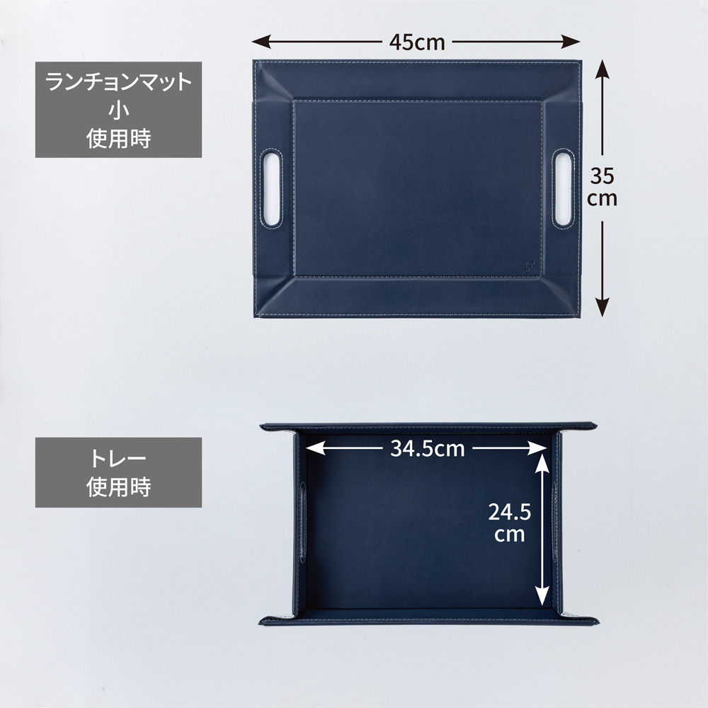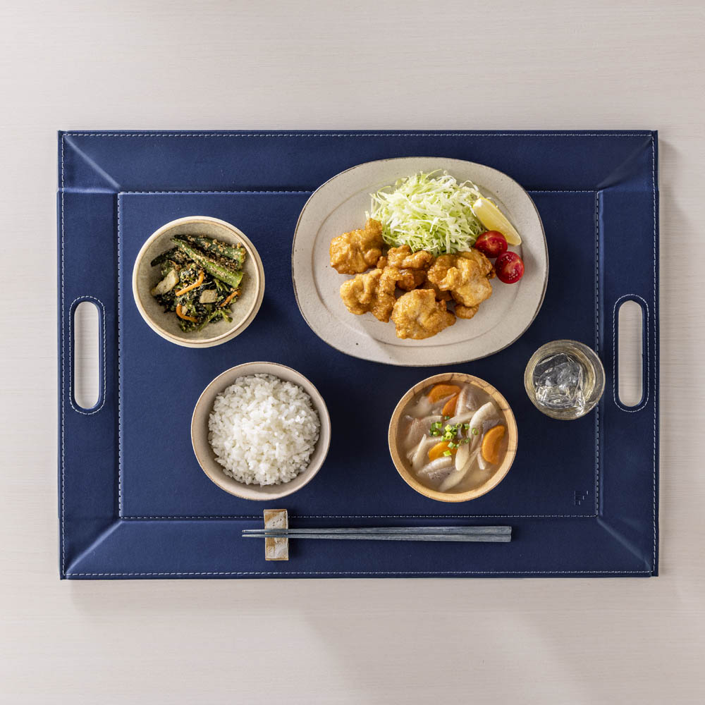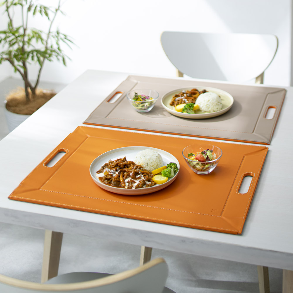 薄い芯材入りのしっかりしたつくりで、持ち上げるとトレー、卓上に置くとランチョンマットに早変わり。表面は滑りにくい仕様なので、食器やカトラリーをのせても安定感がありスムーズに運べます。 ※画像は小サイズ(イ)ネイビー×ライトグレー。