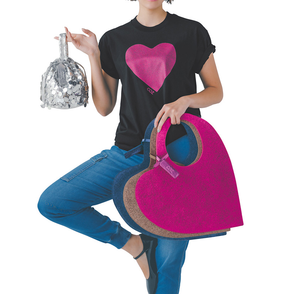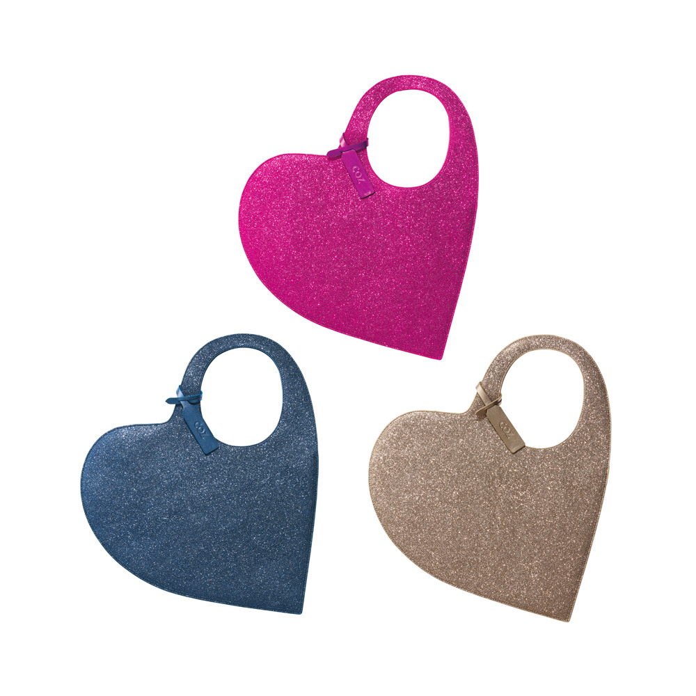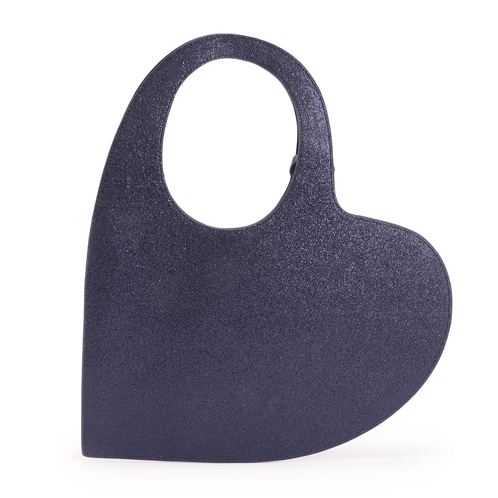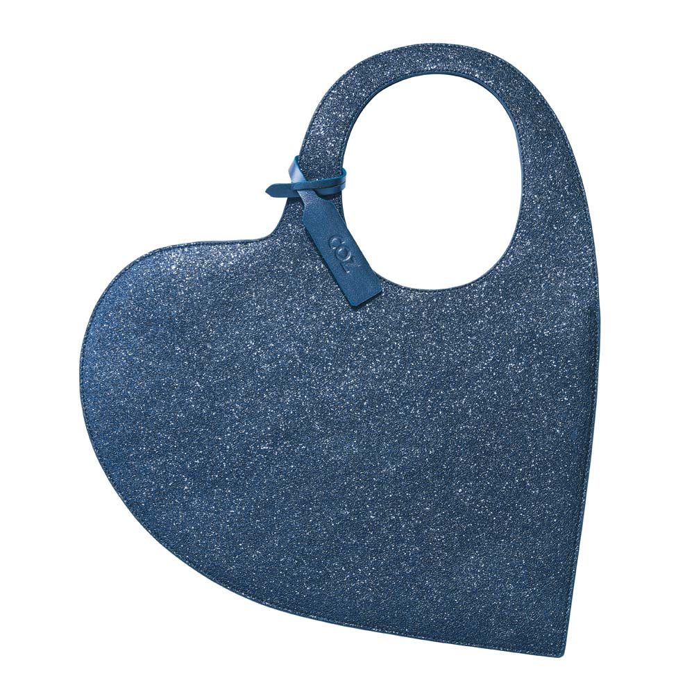 ハートモチーフをトレンドのラメと組み合わせて大胆なバッグにしました。商品画像の説明