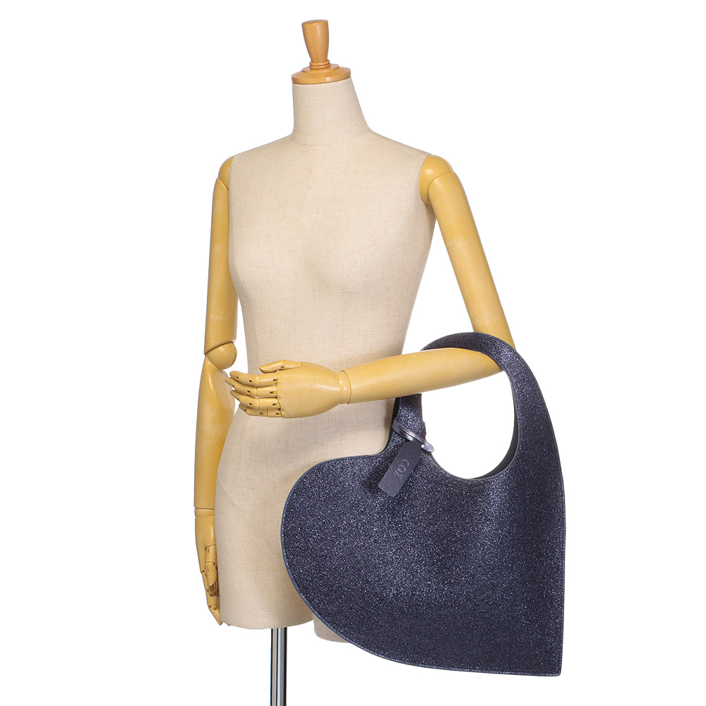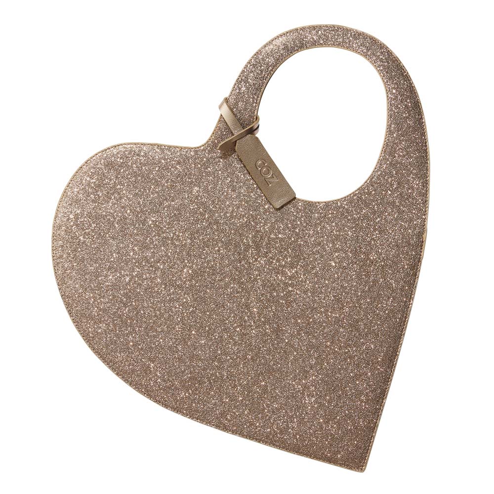 大胆なハートモチーフとメタリックの華やかさが主役級の可愛さを放つトートバッグ。ラメながらなめらかな表面と、内側は同色のスエード調生地で落ち着いたムードに。