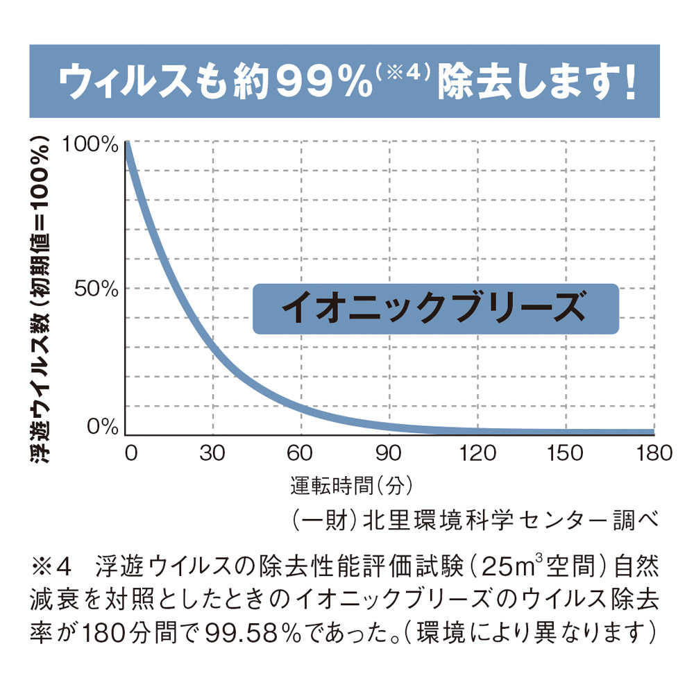 ※1:25畳相当の密閉性の良い部屋で連続使用した場合、3時間後に約90%の室内塵を除去できたことが実験で確認されています。(公的検査機関調べ)