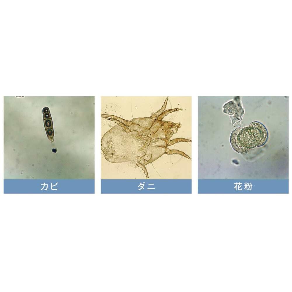 • 集塵板からは、こんな汚れが! モニター宅で8日間使用した結果、カビやダニの死がい、悩ましい花粉も吸着が確認されました。((株)愛研調べ)※使用環境によって異なります。