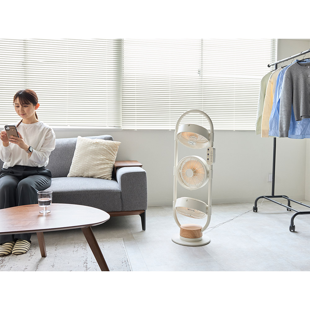 ●扇風機として:それぞれのファンの角度を調節すれば3ヵ所同時に送風できるので、 床に座っている人、ソファに座っている人、立っている人それぞれに心地よい風を送り続けます。