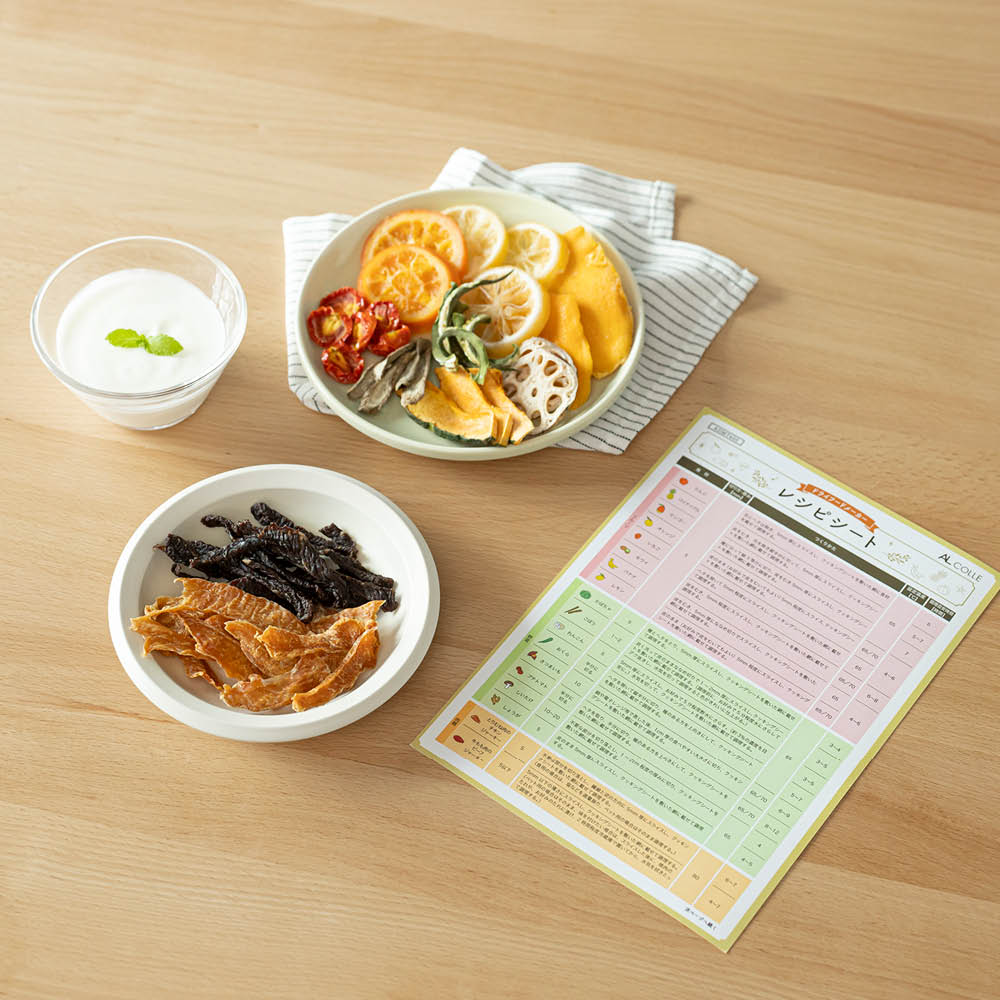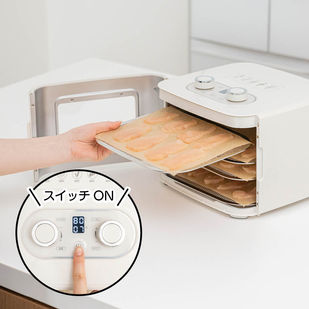 材料を並べたら、レシピシートの調理温度と目安時間に設定してスタートボタンを押すだけ。あとは放っておくだけだから、初めての方でも失敗なく美味しいドライフードができあがります。