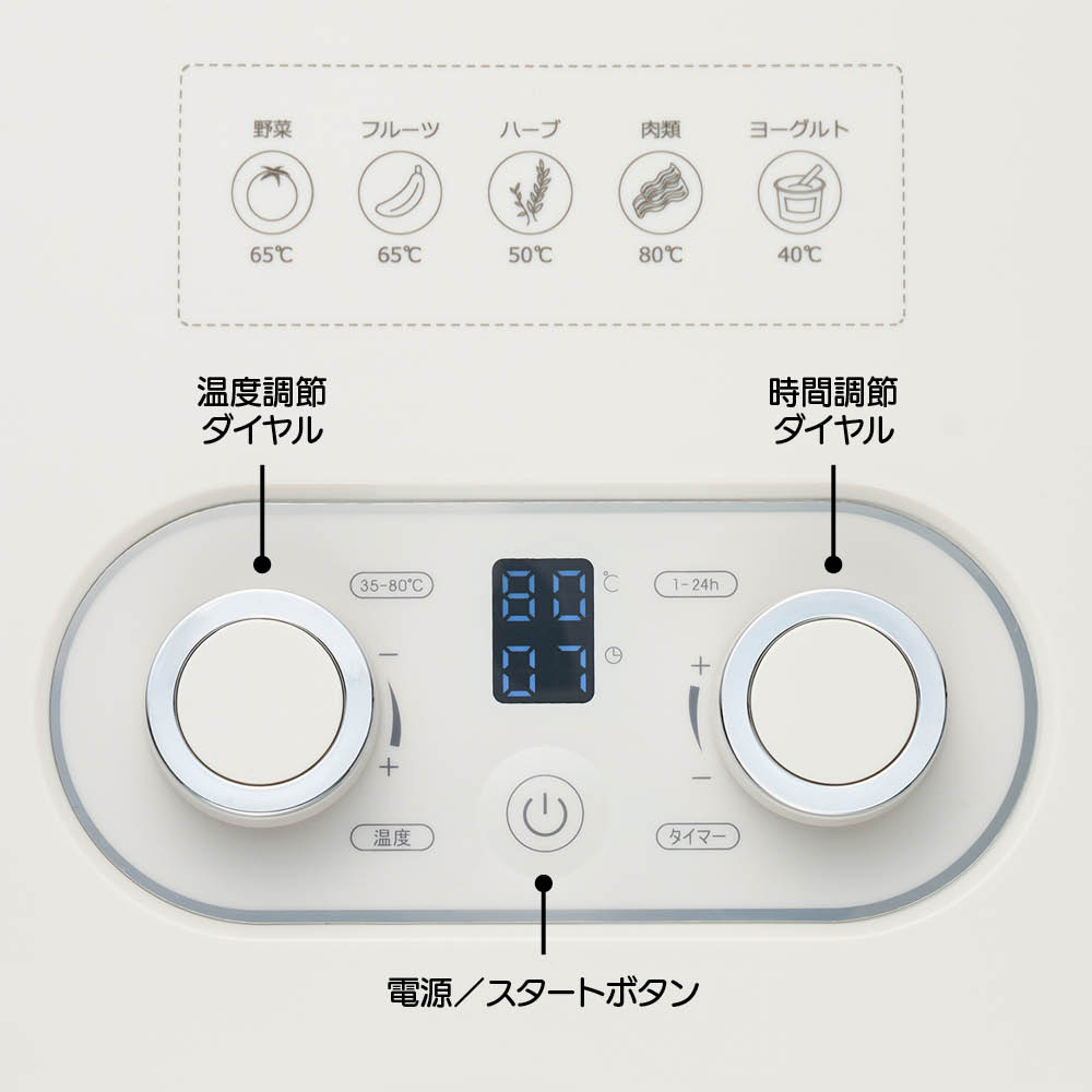 ドライフルーツやジャーキーなどのヘルシーなおやつを始め、料理の幅が広がるドライハーブやドライ野菜もおすすめ。トレーを外し、温度とタイマーを設定すれば自家製ヨーグルトも作れます。手作りを楽しみながら、健康的な食生活を!