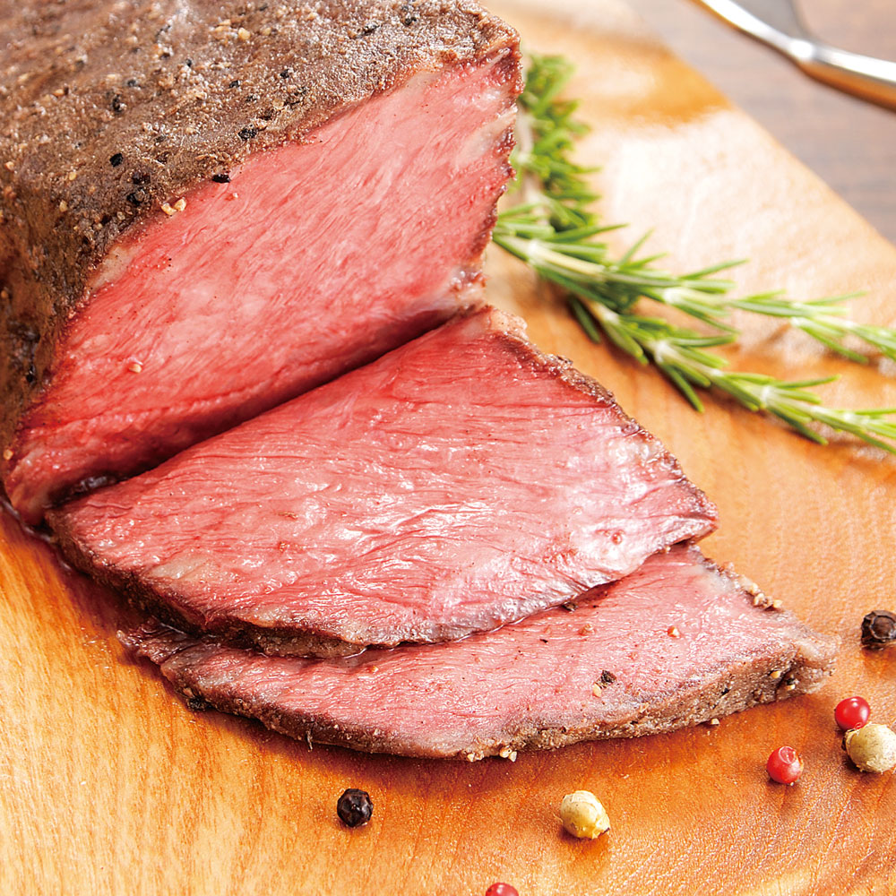 北海道のブランド牛である白老牛のもも肉を、塩・胡椒のみで味付けしたローストビーフです。