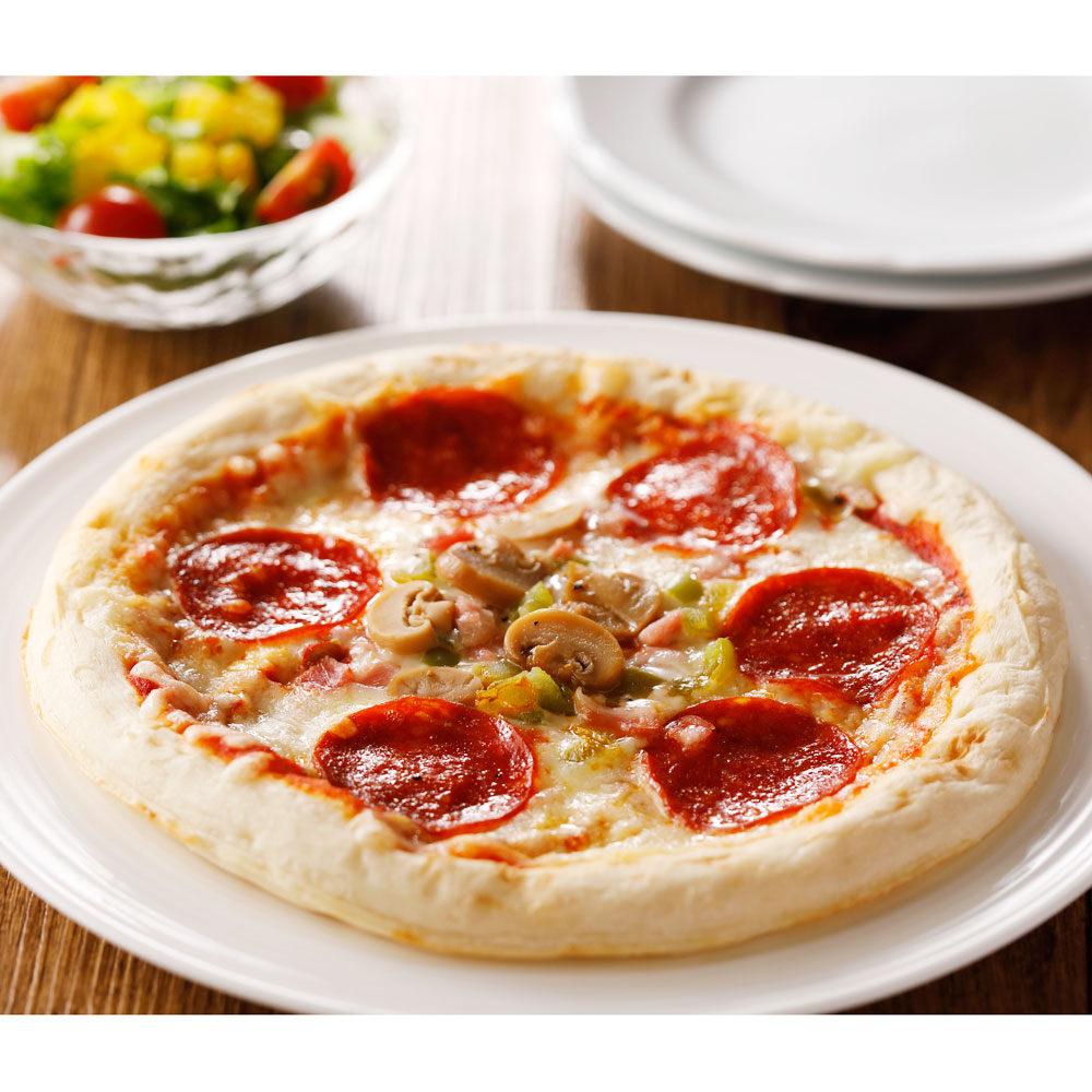 パリッともちもちのナポリ風クラストを使用。ジューシーなトマトソースをベースにコクと旨みのナチュラルチーズとスパイシーなペパロニソーセージ、ベーコン、マッシュルーム、ブラックペッパーをトッピング。