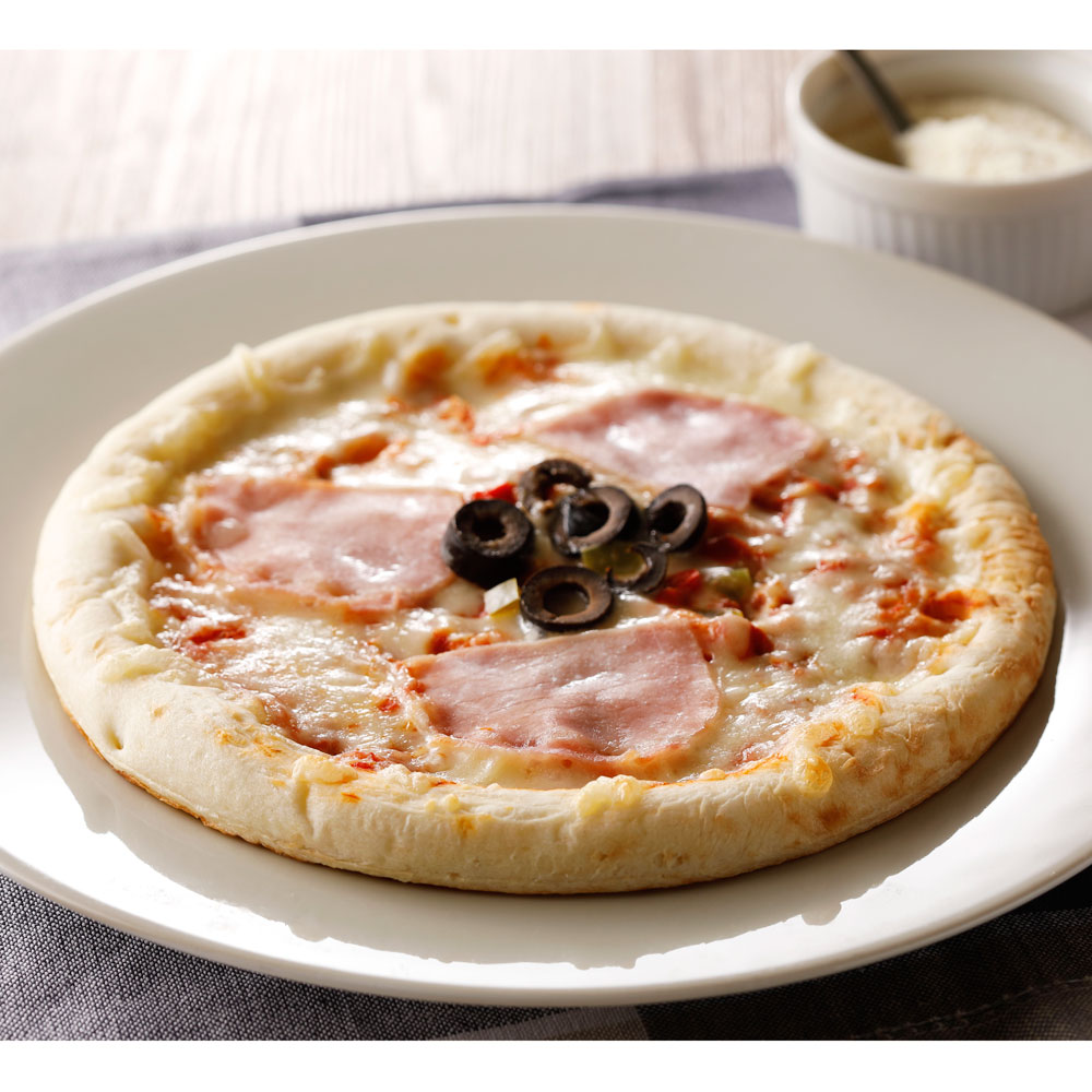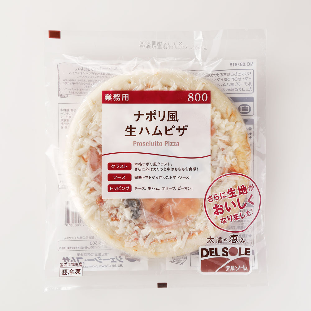 パリッともちもちのナポリ風クラストを使用。トマトソース、ナチュラルチーズ、生ハム、赤ピーマン、ピーマン、ブラックオリーブをトッピング。