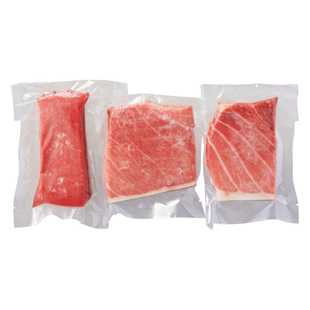 美味しさをキープしたまま、家庭の冷凍庫(-18℃)で1ヶ月間保存できる革命まぐろ「まぐろまん」。ぬるま湯や水で簡単に解凍できます。赤身の部分の中でも中央部分の旨味があり筋のない部分「天身」と、職人が選び抜いた中トロ、大トロをセットでお届けします。