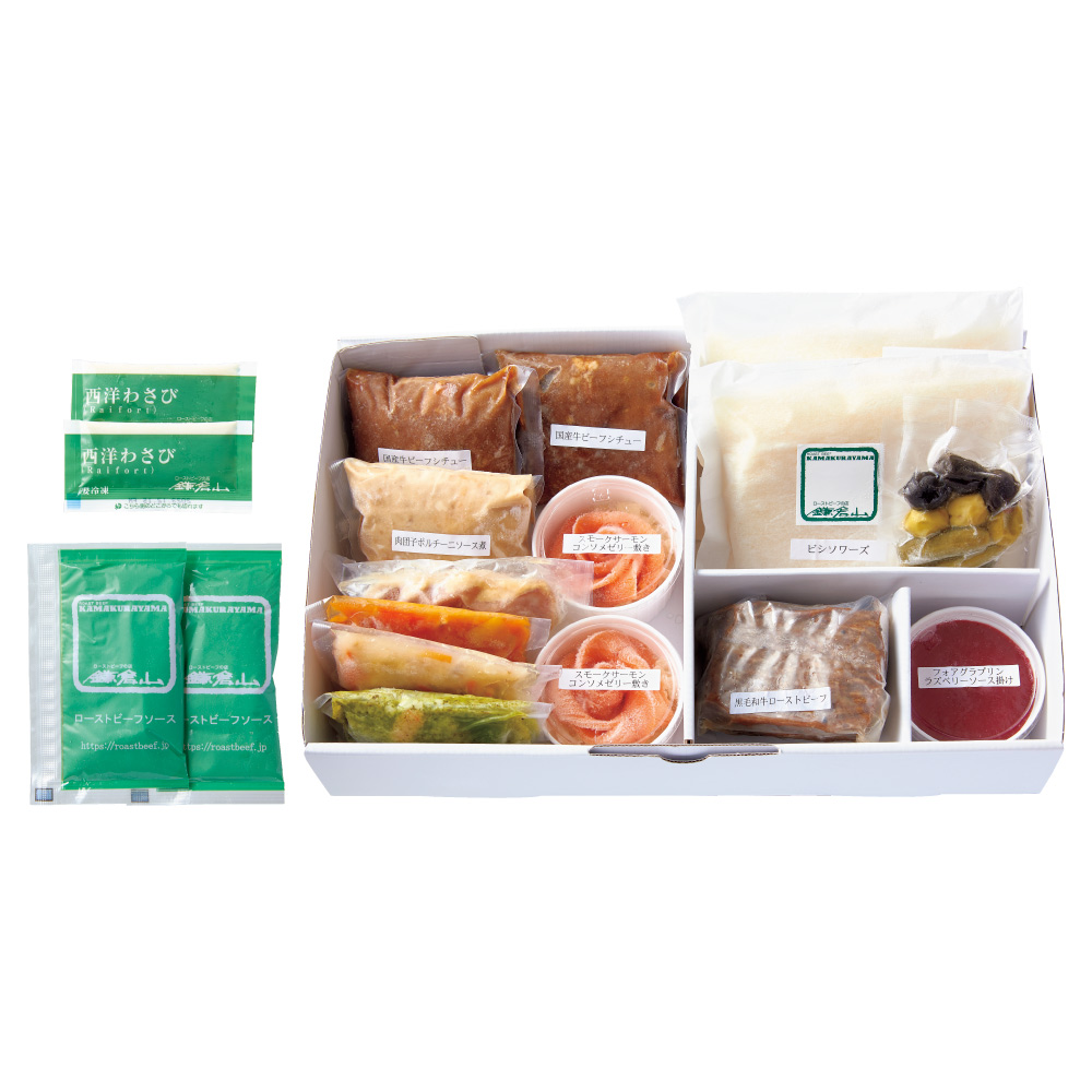 定評ある黒毛和牛のローストビーフに、スモークサーモン、フォアグラやむきエビのバジルソースなど美味しいものを少しずつ。食卓が一気に華やぐ2~3人分の豪華なオードブルセットです。【セット内容】・黒毛和牛ローストビーフ:鎌倉山自慢のローストビーフです。部位はもも肉で、さっぱりとしていながらもと赤身の力強い旨みが楽しめます。ローストビーフソースと西洋わさびもお付けします。・ムキエビのバジルソース和え:バジルの香り豊かなソースに一口サイズのむきえびを和えました。・イトヨリのエスカベッシュ:白身魚のイトヨリを玉ねぎや人参などとお酢で作った酸味が効いたソースでマリネしました・ラタトゥイユ:赤と黄色のピーマンと、ズッキーニ、ナスなどをトマトソースで煮込んだ彩りも豊かなひとしなです。・塩麹漬ローストチキン:鶏肉を塩麹で漬け込んだ、柔らかなローストチキンです。・コルニッション:コルニッションとは小さなきゅうりの酢漬けのこと。パリポリとした食感は箸休めにもピッタリです。・スタッフドオリーブ・ブラックオリーブ:黒と緑の彩りも豊かなオリーブです。・ポルチーニソース掛け肉団子:鶏団子をポルチーニで作る滑らかなソースでいただきます。ソースと肉団子の旨みのコントラストをお楽しみください。・フォアグラプリンラズベリーソース掛け:フォアグラとクリームチーズなどで作った濃厚な香り豊かなプリンをラズベリーソースをかけました。甘さは控え目なのでスイーツとしてもワインのあてにもおすすめです。・スモークサーモントラウトフラワーコンソメゼリー添え:お花の形に仕立てたスモークサーモンを風味豊かなコンソメゼリーでいただく冷菜です。・国産牛ビーフシチュー:ごろっとした牛肉をじっくり煮込んだビーフシチューです。・ビシソワーズ:じゃがいもの風味豊かな特製スープ。お腹を温める前菜にも、食事の最後にもおすすめです。※別途で「ローストビーフの店 鎌倉山」の看板メニューである、サーロインのローストビーフとヒレ肉の特別なローストビーフもございます。是非ご検討ください。