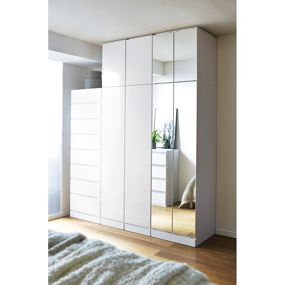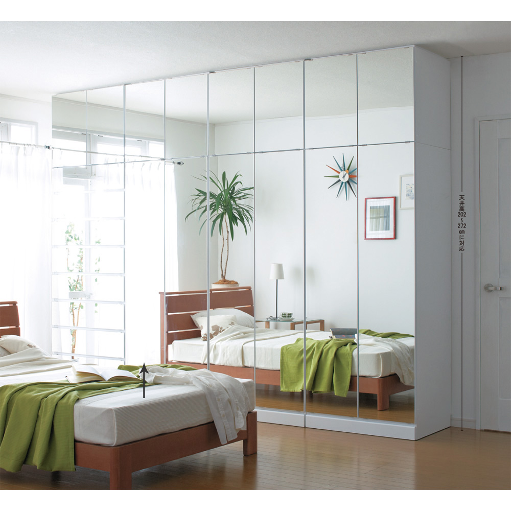 表面材の仕様は、寝室などの設置しても空間が広く見えるミラー扉タイプ、美しい光沢のホワイト色の板扉タイプからお選びいただけます。