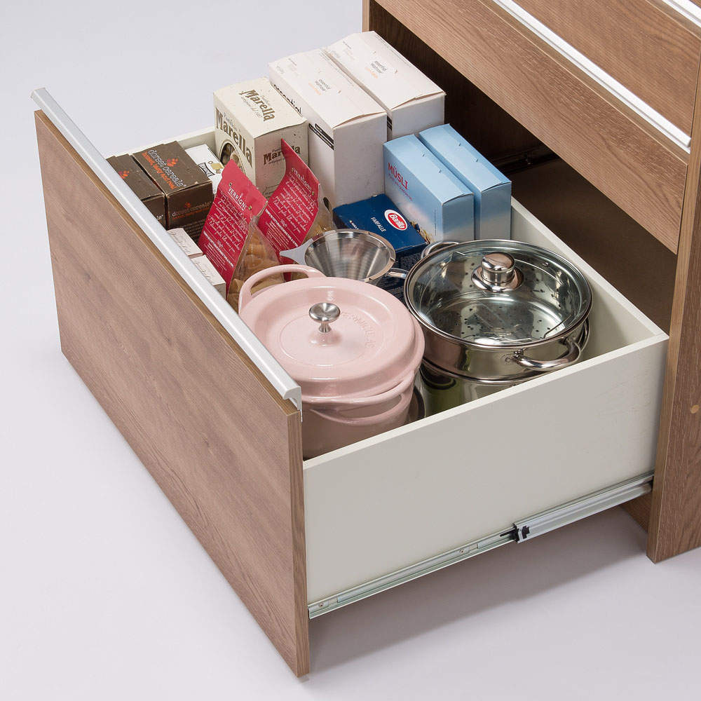 ■引出し全段にフルスライドレールを採用。■奥まで開閉スムーズで出し入れ楽々。