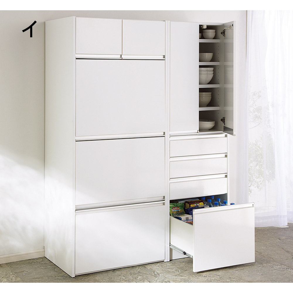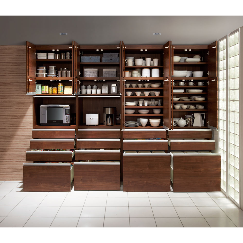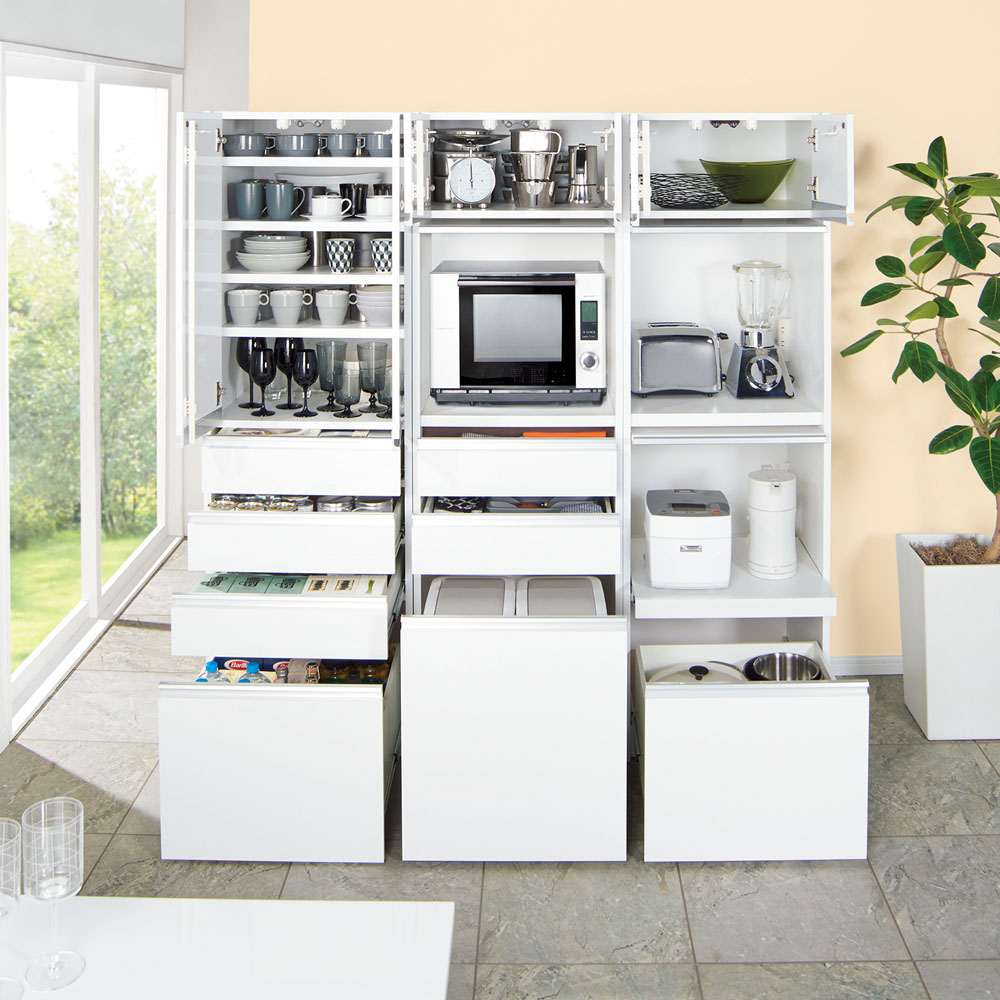 ごちゃつきを簡単に扉で隠せるキッチン収納シリーズ。奥行があり大型電子レンジやスチームレンジも隠せます。キッチン家電や電子レンジを隠すと、お洒落な雰囲気に。シリーズの上置きは高さオーダー可能で作り付けのよう。細部までこだわり機能が満載の高機能シリーズです。