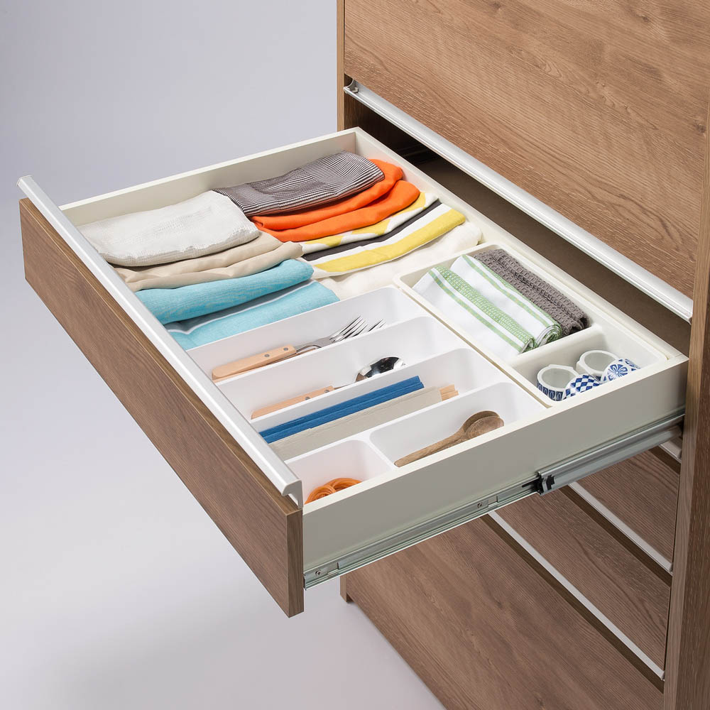 ■横に長く掴みやすい取っ手は忙しい家事を意識し設計。■引出し内部はクリーンなホワイト調で収納物に配慮。