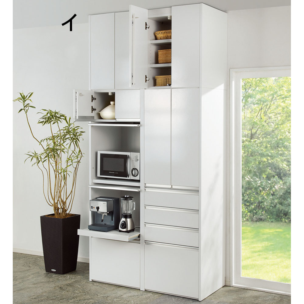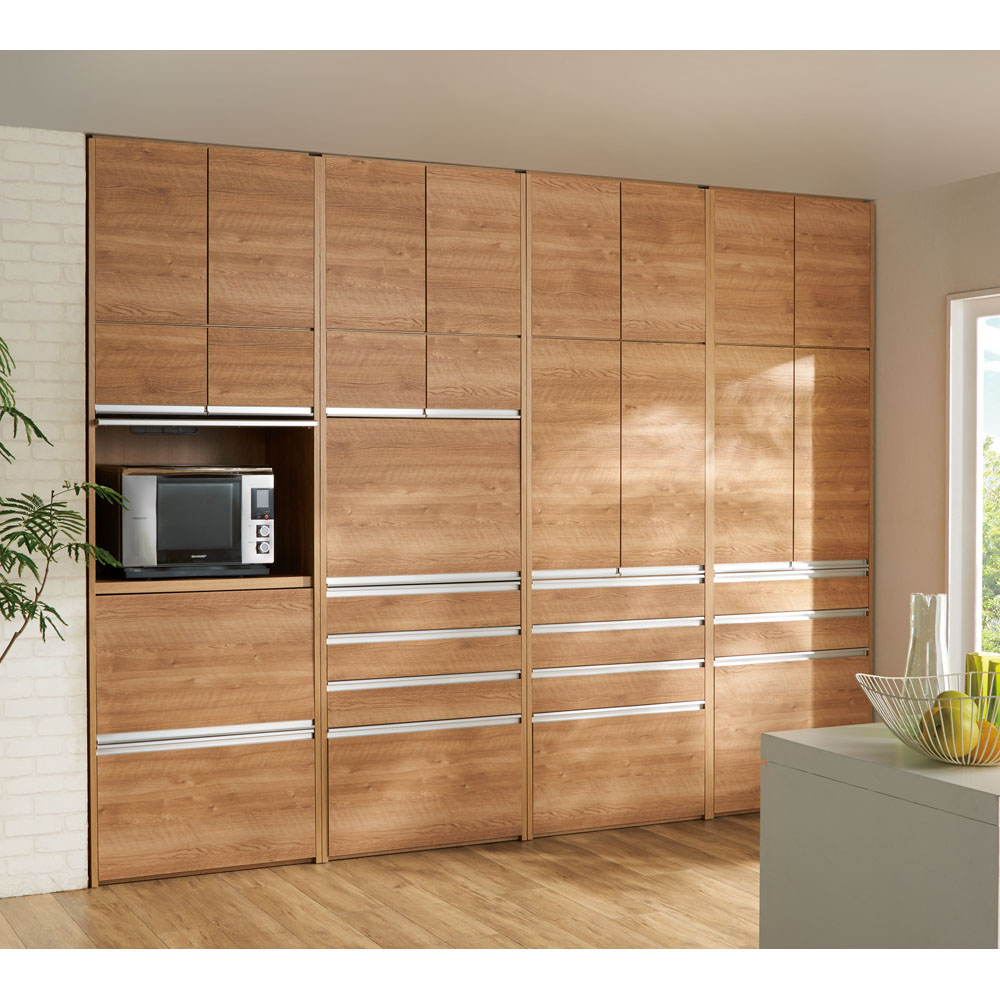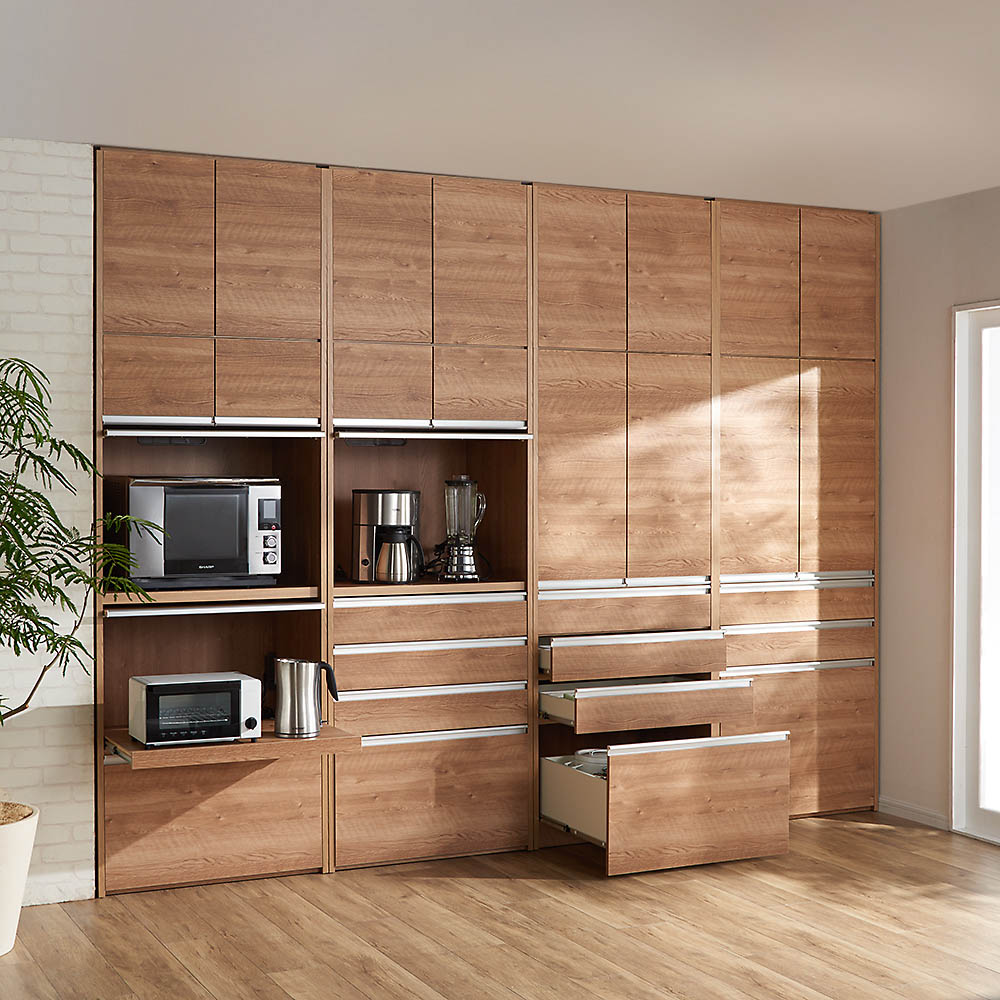 ごちゃつきを簡単に扉で隠せるキッチン収納シリーズ。奥行があり大型電子レンジやスチームレンジも隠せます。キッチン家電や電子レンジを隠すと、お洒落な雰囲気に。シリーズの上置きは高さオーダー可能で作り付けのよう。細部までこだわり機能が満載の高機能シリーズです。