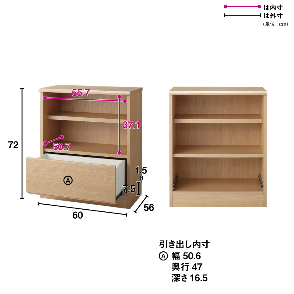 こちらは、幅60cmサイズオーダー高さ58cm・72cm オープン棚&引き出しタイプです。