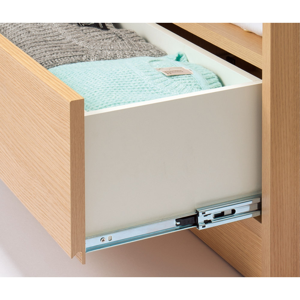 引き出しは全段、奥までしっかり開けられて、抜け落ちる心配もないストッパー付きフルスライドレール仕様です。