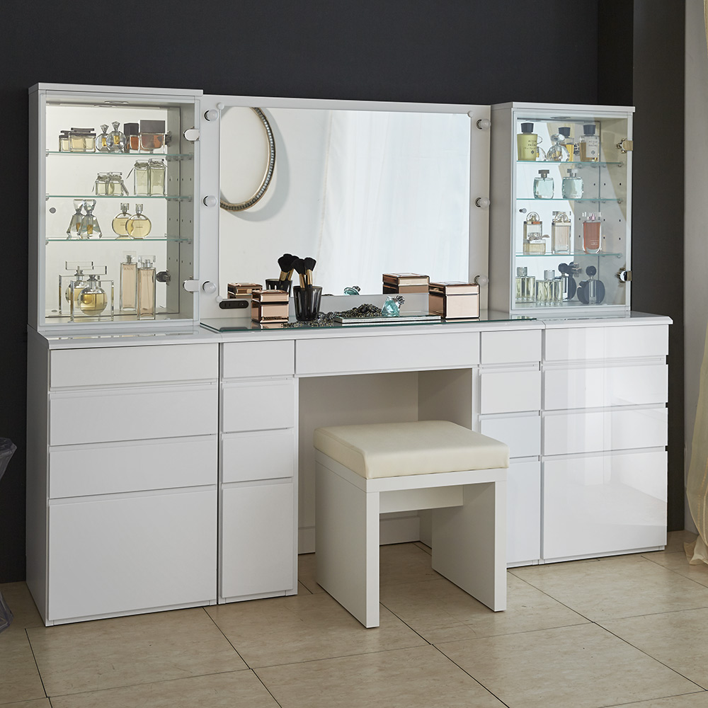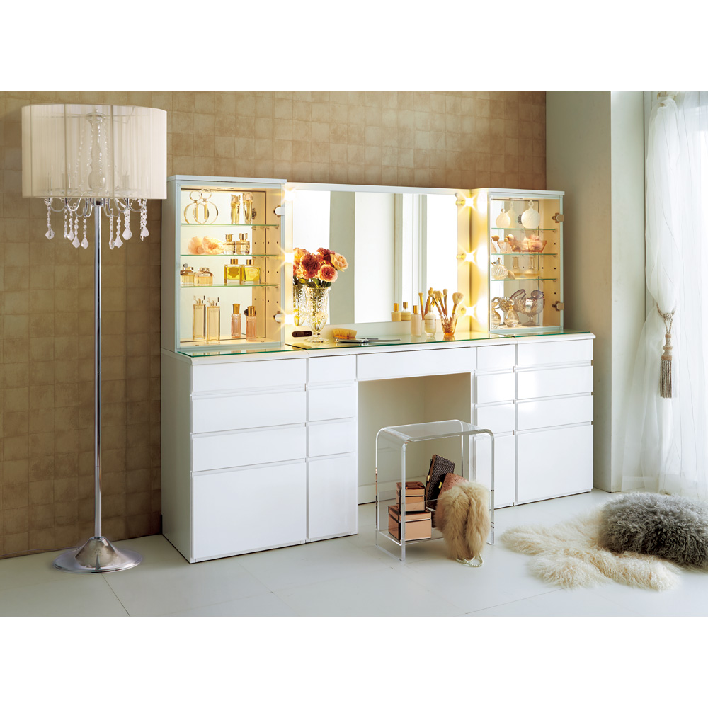 チェストはお気に入りのコスメや香水を美しくライトアップしながら収納。背面ミラー貼り&ガラス棚でライトの光が煌びやかに輝きを増し、ラグジュアリーな表情を魅せます。