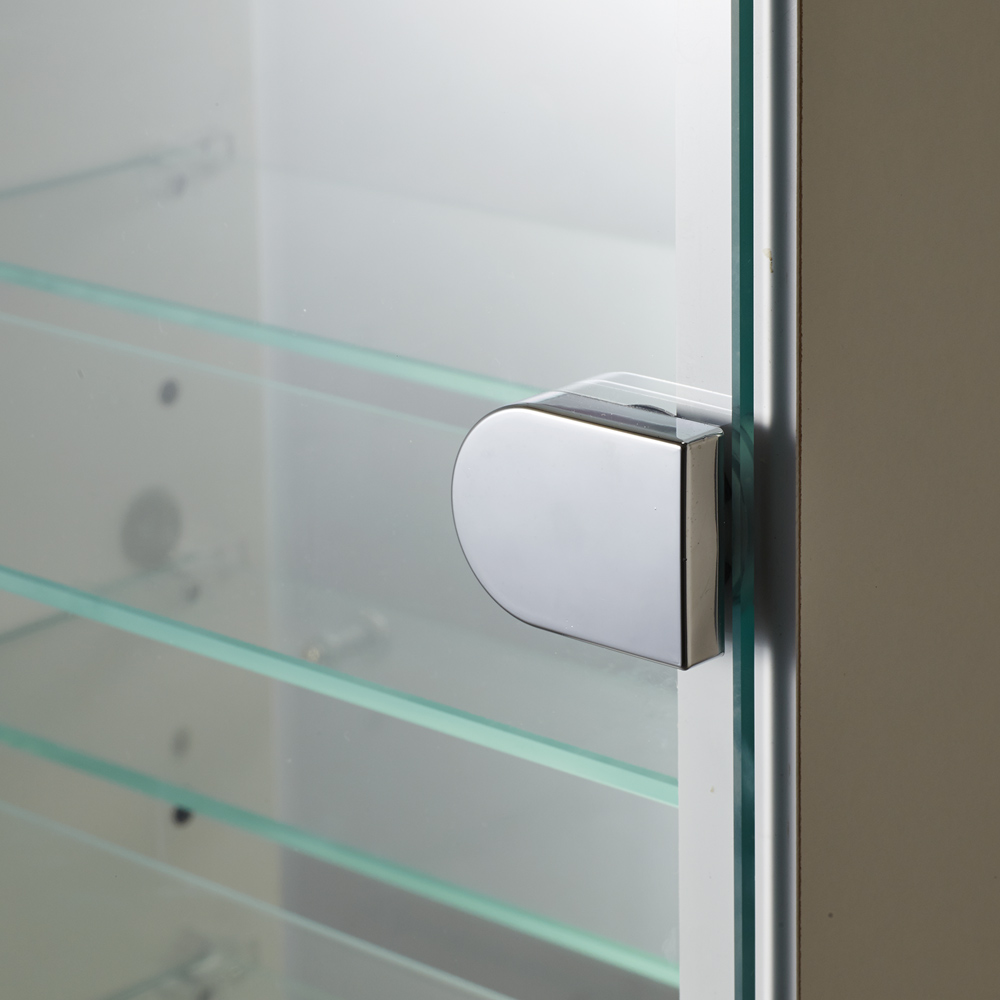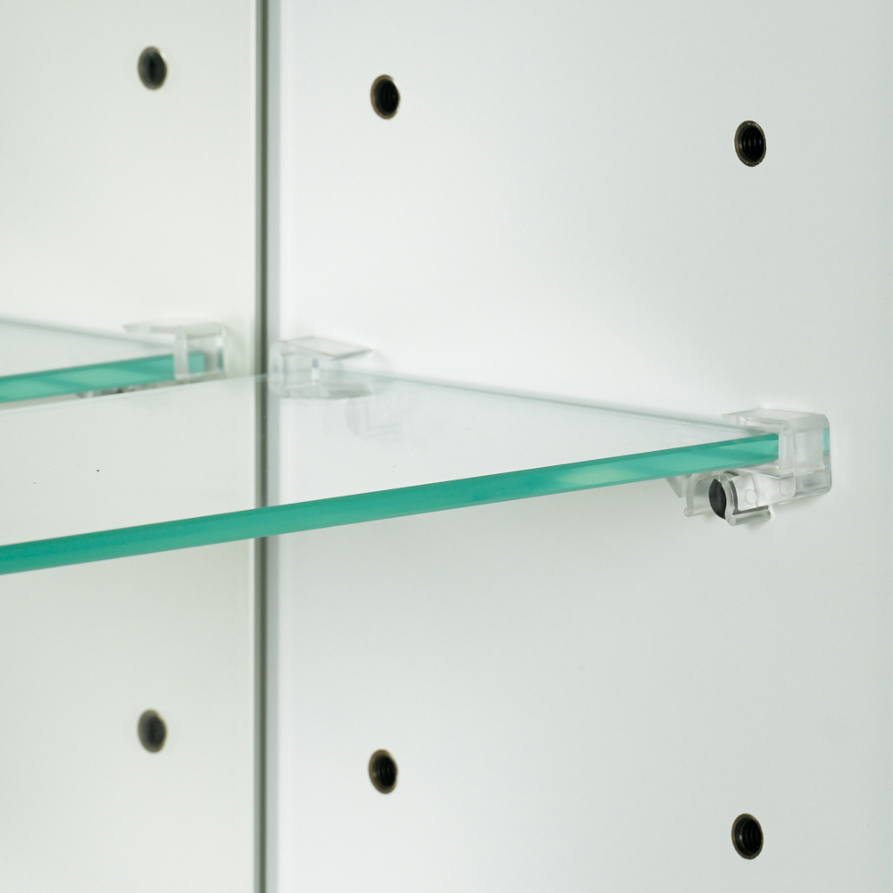 光を通す強化ガラス製飾り棚は、6cm間隔で高さを調節できます。ガラス棚はしっかりと固定できるので安心です。