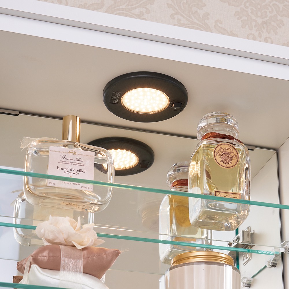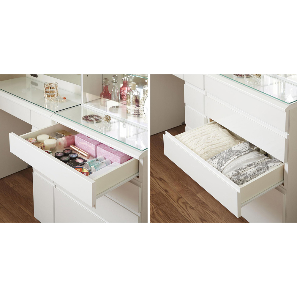 チェスト上部のLEDをつければ、お気に入りのコスメや香水をライトアップしながらディスプレイ。背板ミラー貼り&ガラス棚で光がさらに輝きを増し、ライト脇のスイッチでオン・オフも手軽に。