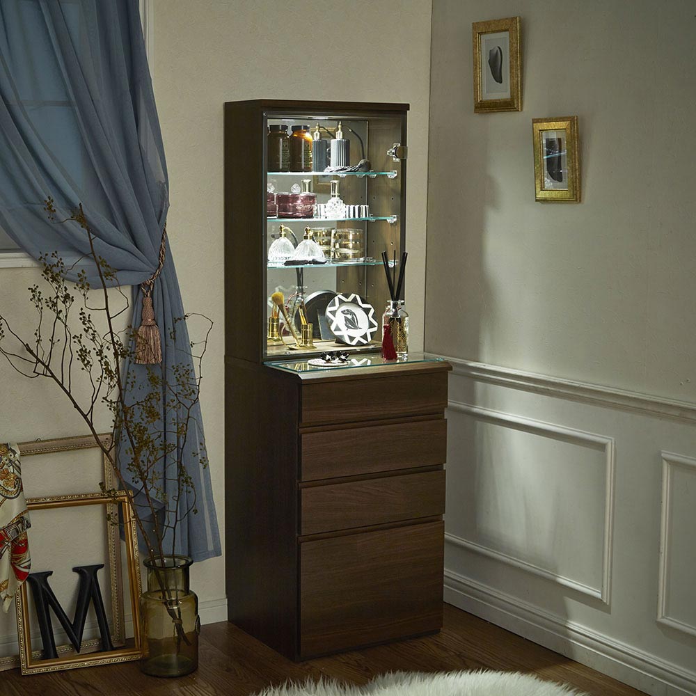 使用例(ダークブラウン幅45cm)LEDライトで優雅な輝きチェスト上部のLEDをつければ、お気に入りのコスメや香水をライトアップしながらディスプレイ。背板ミラー貼り&ガラス棚で、光がさらに輝きを増します。
