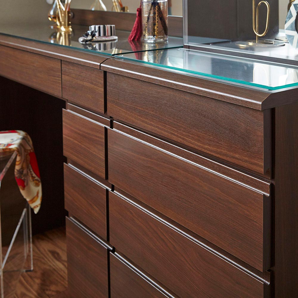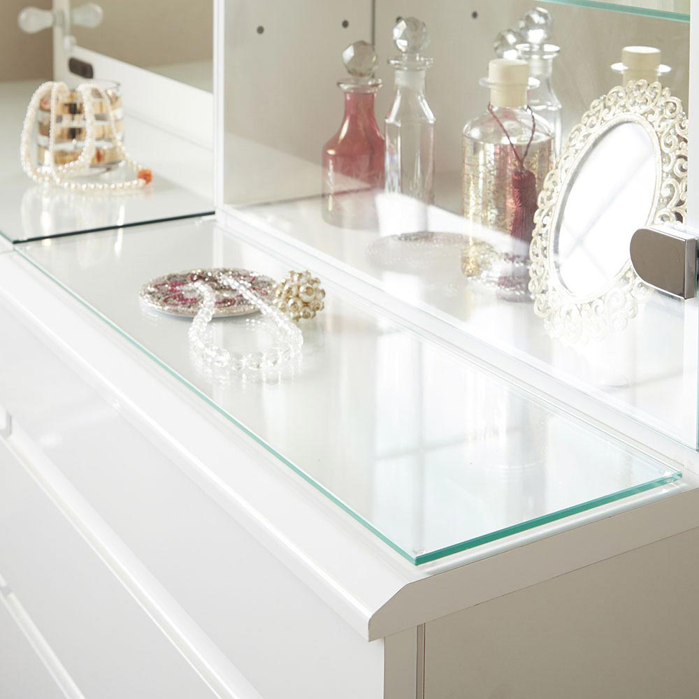 美しくお手入れ簡単な「強化ガラス天板」天板・収納棚は強化ガラスで、化粧品や香水が液だれしても簡単にお手入れできます。