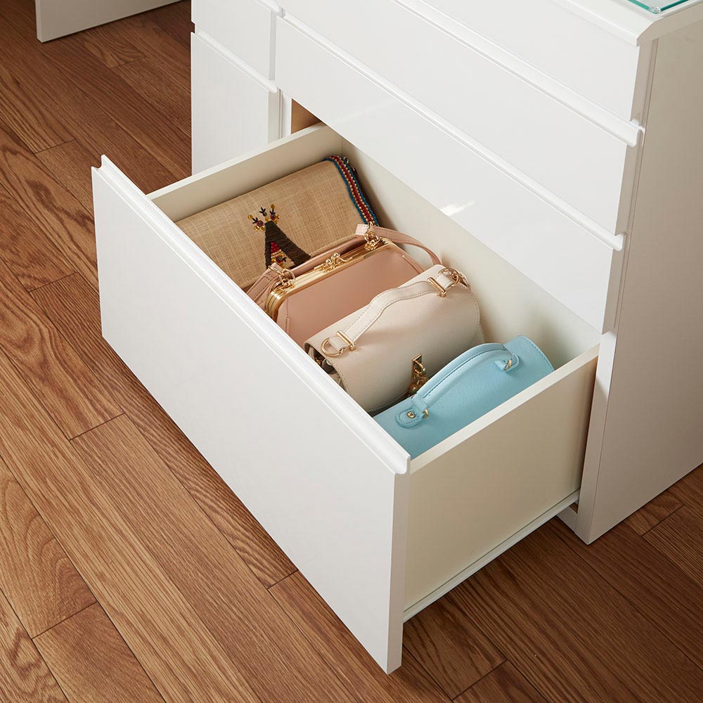 引き出しで隠す収納も引き出しは強度のある箱組仕様で。すべてレール付きで出し入れもスムーズ。アクセサリーやコスメ、メイク道具、ブラシなどをすっきり隠して収納できます。クローゼットやベッドサイドの衣類収納、バッグ収納、アクセサリーケースとしても活躍します。