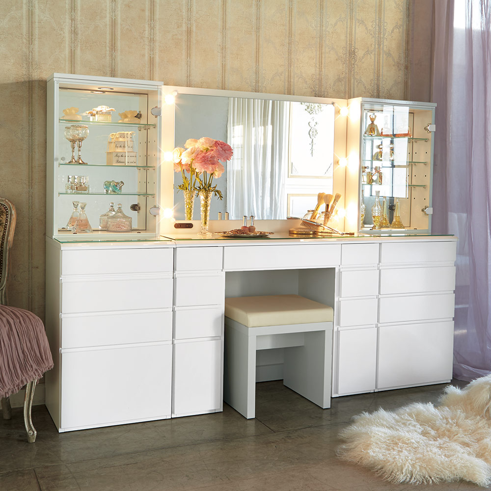 コーディネート例(ホワイト 左・右:チェスト幅45cm、中央:ドレッサー幅99cm)ドレッサーとのコーディネートで、憧れのメイクルームをシリーズ商品の「LEDライト付きドレッサー」と組み合わせると、さらにラグジュアリーな空間に。コスメを美しく飾って、光を集めた楽屋のような女優気分のメイクスペースが叶います。プロのメイクアップルームのような、一層心華やぐ空間を演出。