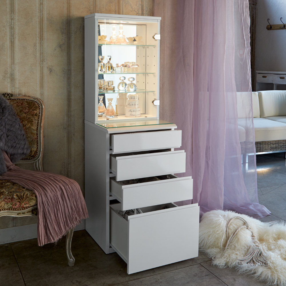 チェストはお気に入りのコスメや香水を美しくライトアップしながら収納。背面ミラー貼り&ガラス棚でライトの光が煌びやかに輝きを増し、ラグジュアリーな表情を魅せます。
