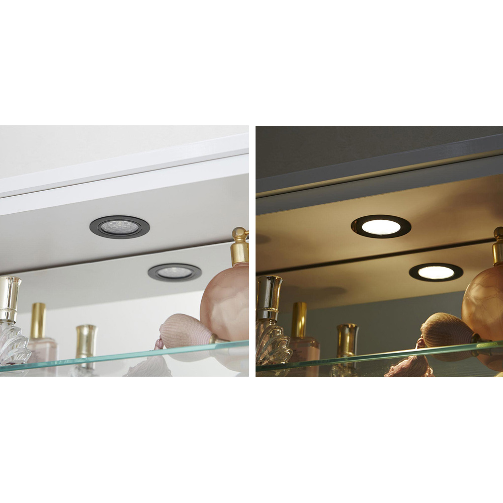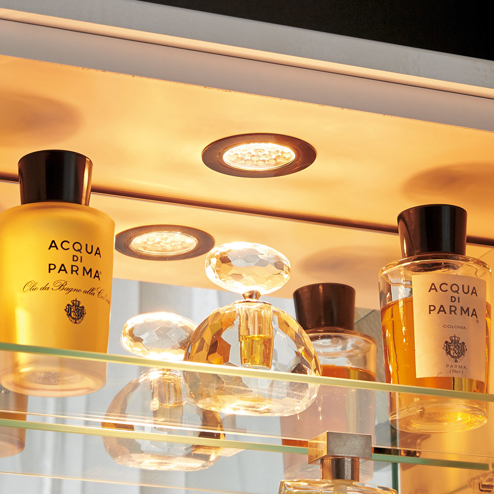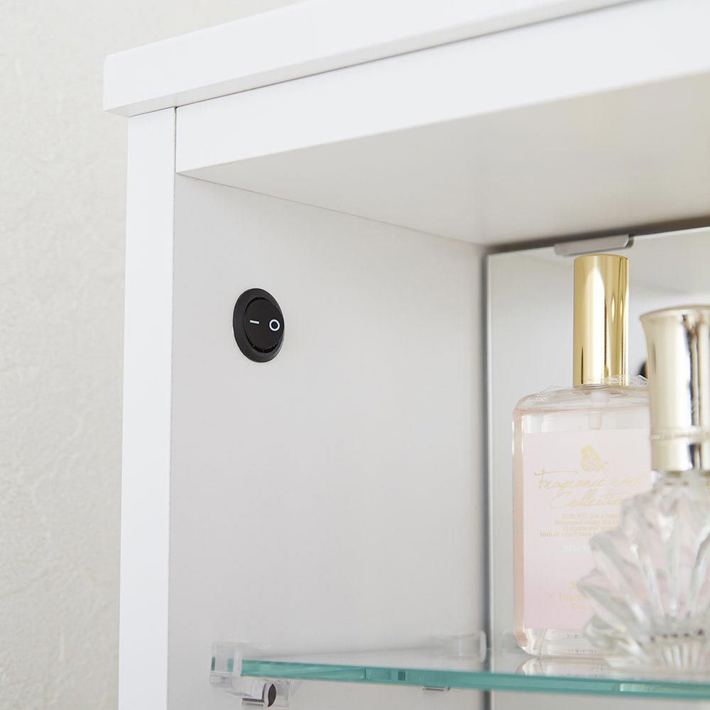 チェスト上部のLEDをつければ、お気に入りのコスメや香水をライトアップしながらディスプレイ。背板ミラー貼り&ガラス棚で光がさらに輝きを増し、ライト脇のスイッチでオン・オフも手軽に。