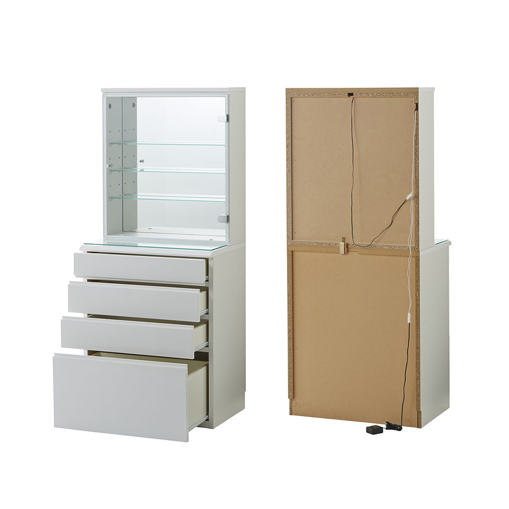 使用例(ホワイト幅60cm)LEDライトで優雅な輝きチェスト上部のLEDをつければ、お気に入りのコスメや香水をライトアップしながらディスプレイ。背板ミラー貼り&ガラス棚で、光がさらに輝きを増します。