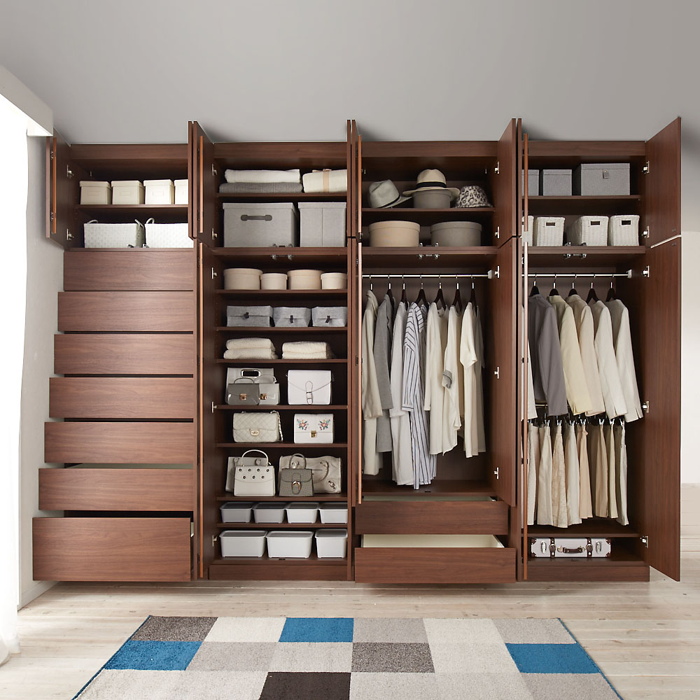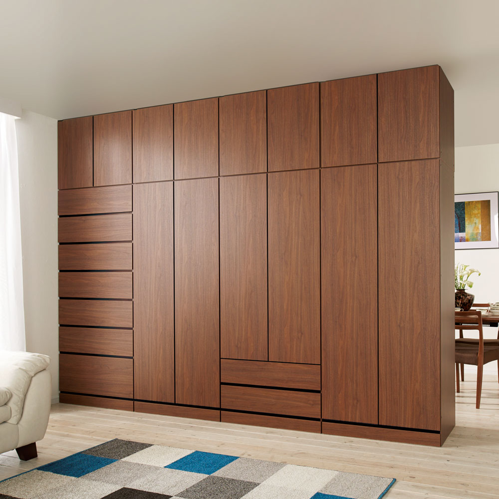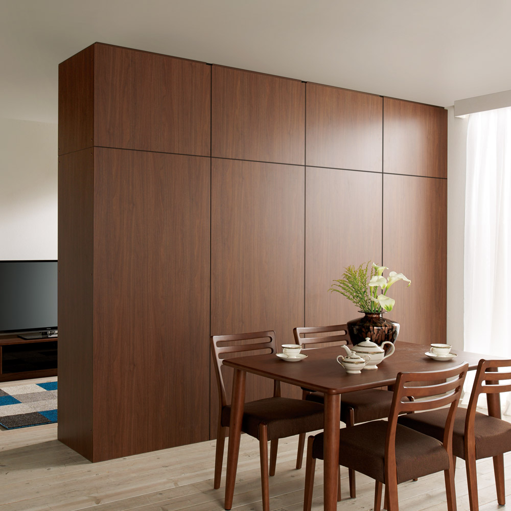 ・お部屋のインテリアになじみやすい、落ち着いた印象のダークブラウン色の横目木目柄。建具に合わせてリビングルームでも、寝室、ウォークインクローゼットでも置き場所を選びません。・間仕切り仕様の背面も木パネルを貼り合わせた高級仕様。間仕切り家具として使用した場合でもしっかりと壁面になってくれます。