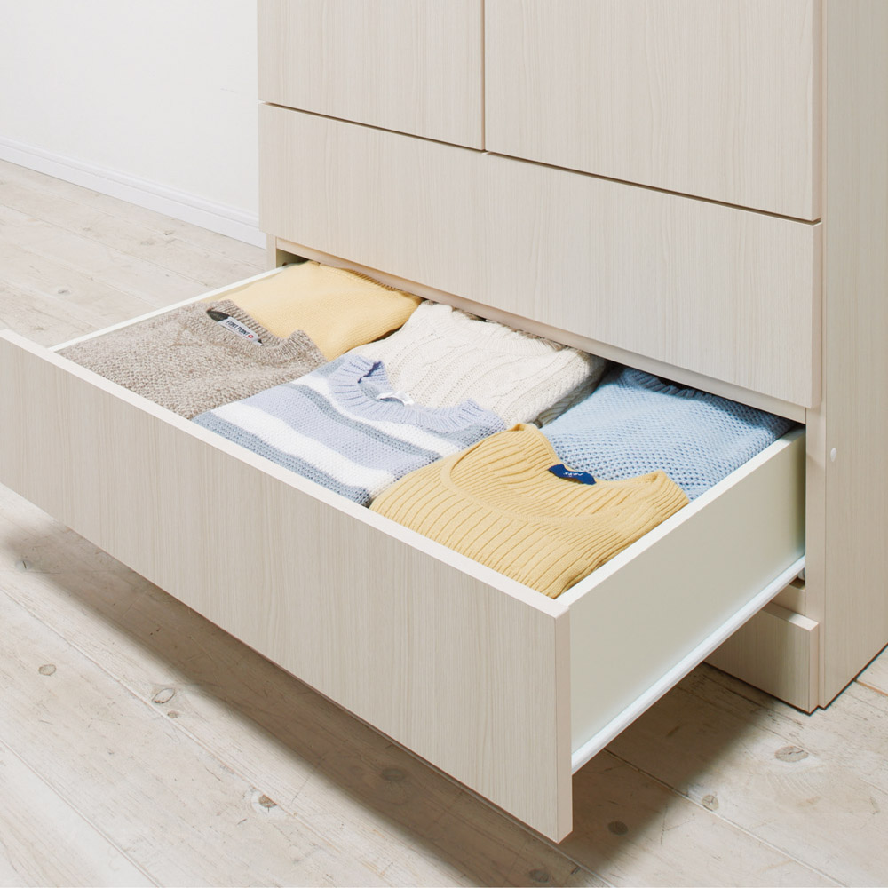 衣類がたっぷり入る、奥行内寸47cmの引き出し。全段ストッパー付きスライドレール仕様です。