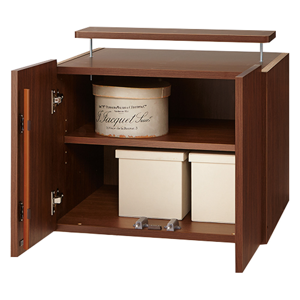 内部の構造(ウ)ブラウン 棚板3cmピッチ5段階調整。扉はプッシュ式。