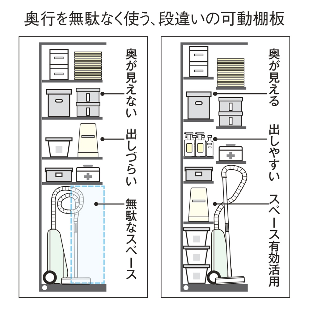 長くかさばる掃除用具や、季節家電の収納に便利な段違い棚タイプ。前・後棚の使い分けで、サイズや使い勝手に合わせてスペースをアレンジ。