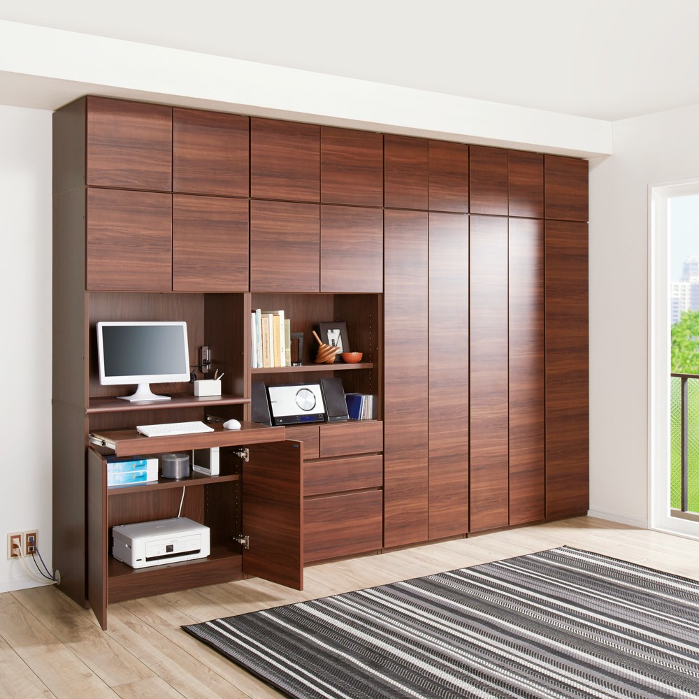 コーディネート例(ウ)ダークブラウン PCデスクや配線自在のオープン棚で、実現できる機能的なホームオフィス。 ※写真の梁下高さ220cm