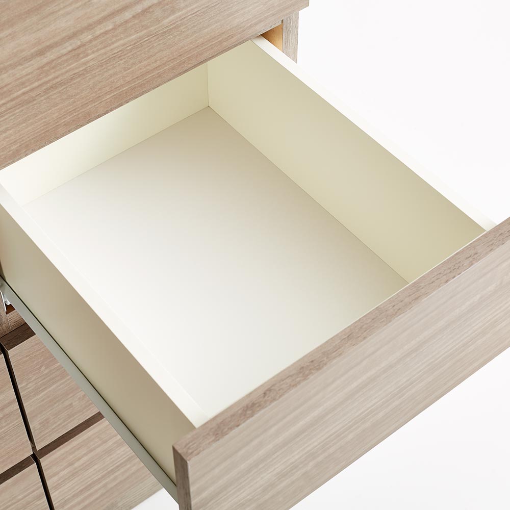 ■引き出し内部は清潔感のあるホワイトカラーで化粧を施し、収納物に配慮しました。■本体の地板は奥までしっかり幅を持たせることで、収納した衣類の引っ掛かりを軽減。本体の強度をより高める効果も。