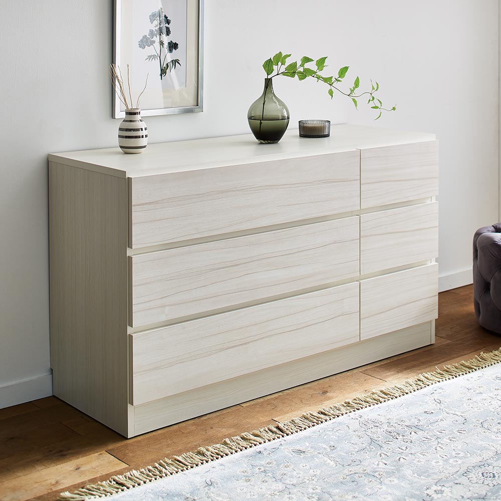 チェストらしいシルエットやサイズ感はそのままに、おしゃれなインテリアスタイルを損ねないカラーバリエーションでご用意しました。なりたいお部屋のスタイルや、お住まいのお部屋の内装に合わせてお選びいただけます。ホワイト木目