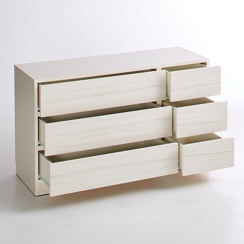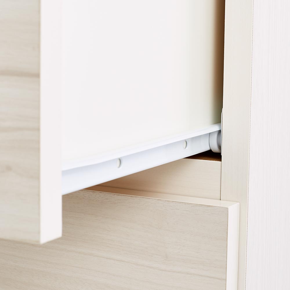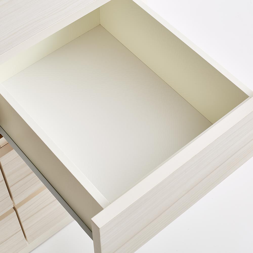 ■引き出し内部は清潔感のあるホワイトカラーで化粧を施し、収納物に配慮しました。■本体の地板は奥までしっかり幅を持たせることで、収納した衣類の引っ掛かりを軽減。本体の強度をより高める効果も。