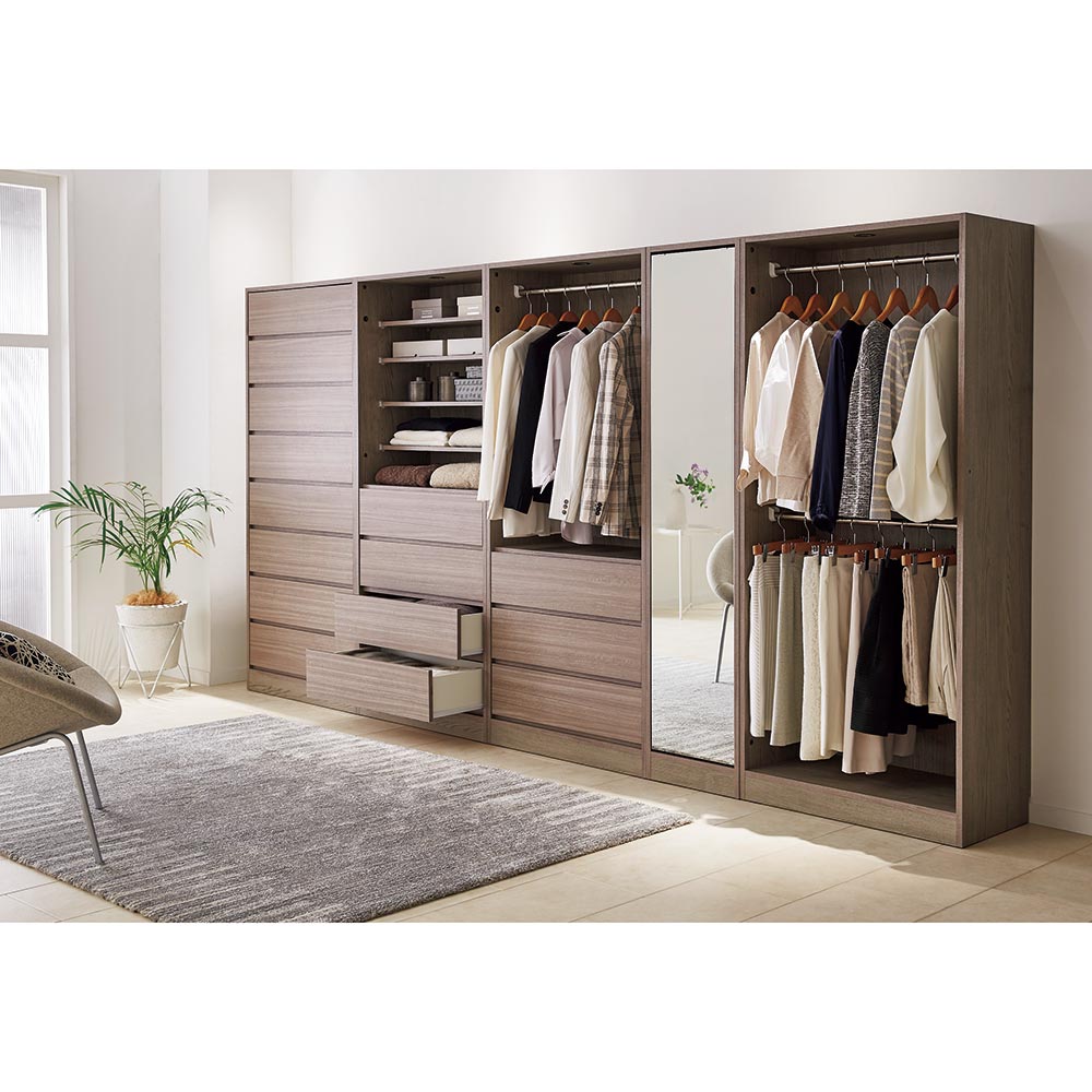 豊富なラインナップで、上質感漂うショップのようなクローゼットをコーディネート。オープンワードローブ本体と別売りで上置きをご用意しております。
