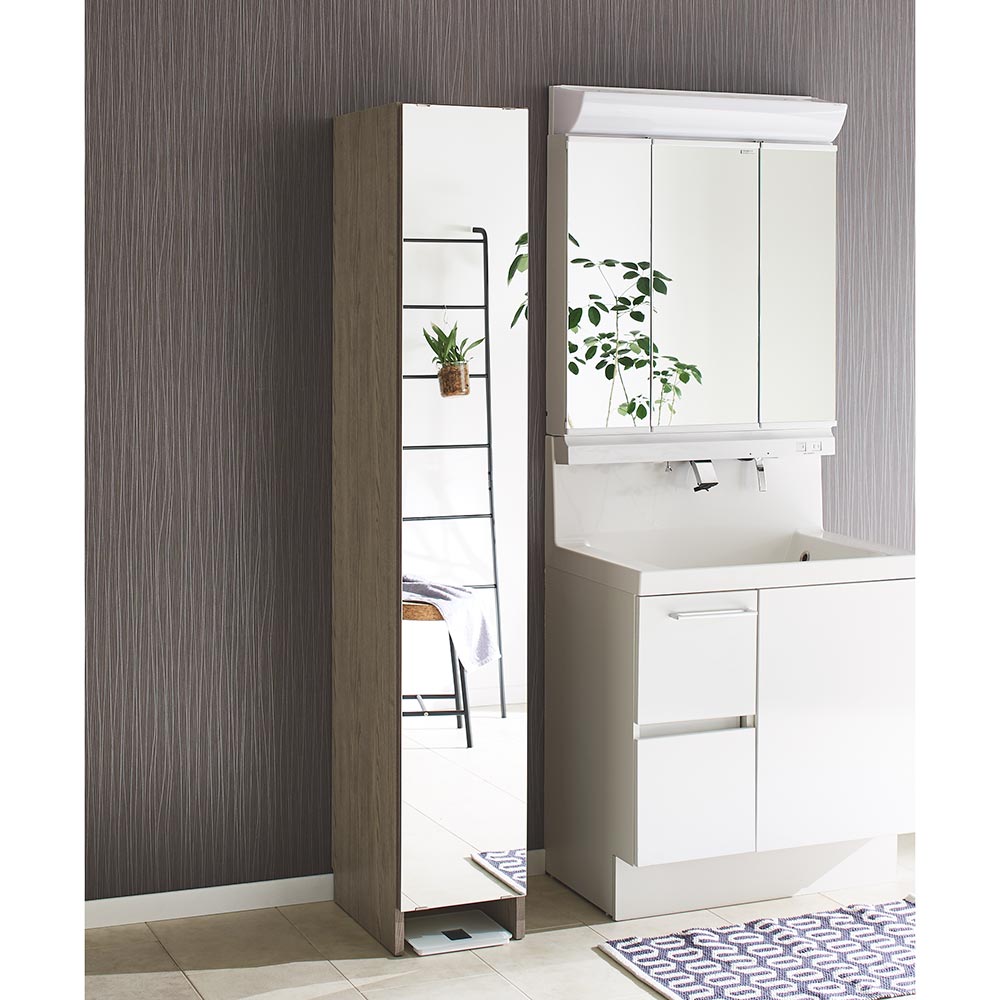 (イ)グレーウォルナット 姿見を兼ねたストッカーは、余裕のない洗面所周りを広く感じさせる効果も。
