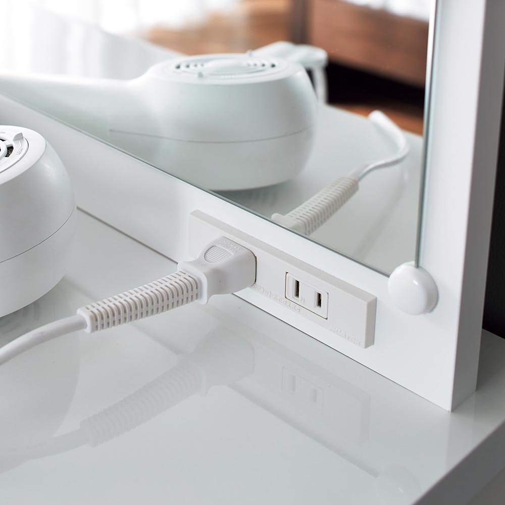 ■2口コンセント(計1500W)付きで、アイロンやドライヤー、スチーマーは勿論、スマホ重電なども安心。■引き出し内部もホワイトで仕上げ、お手入れしやすく清潔に使えます。