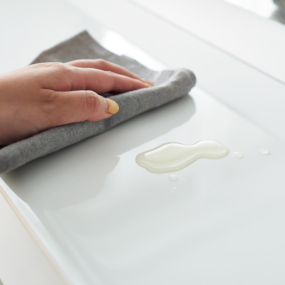 天板は汚れがサッと拭き取れるメラミン仕上げ。うっかり化粧品をこぼしても水拭きが可能です。
