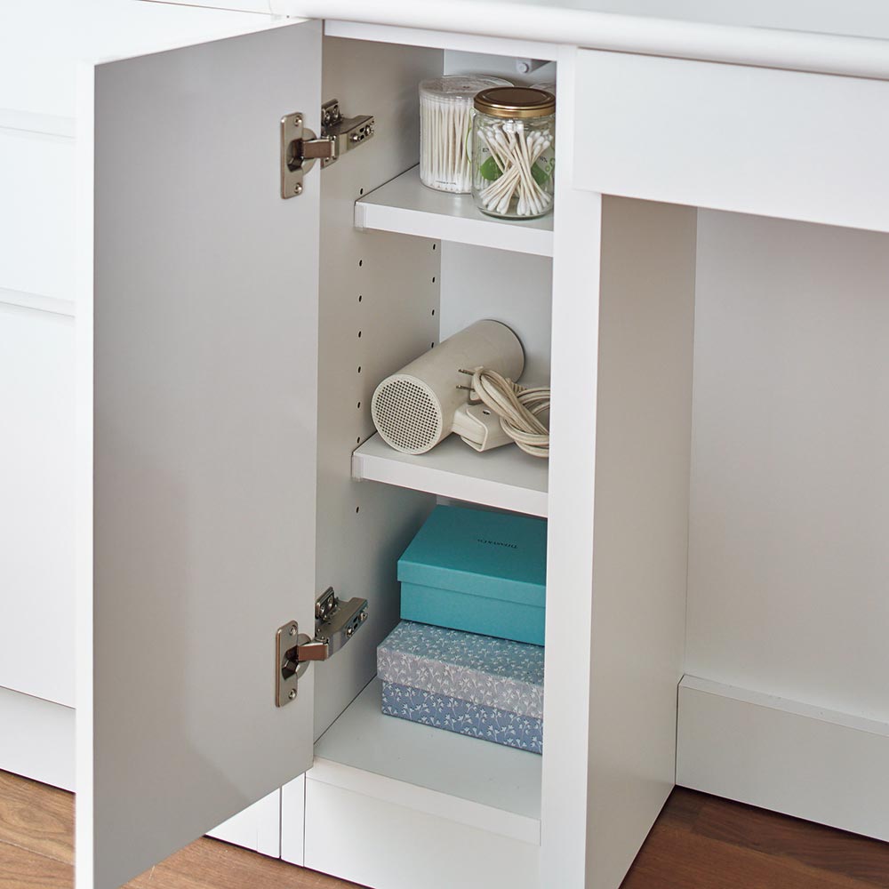 コットンの箱など大きめの物は扉収納部の棚にすっきり収まります。内部の棚は可動棚で調整もOK。