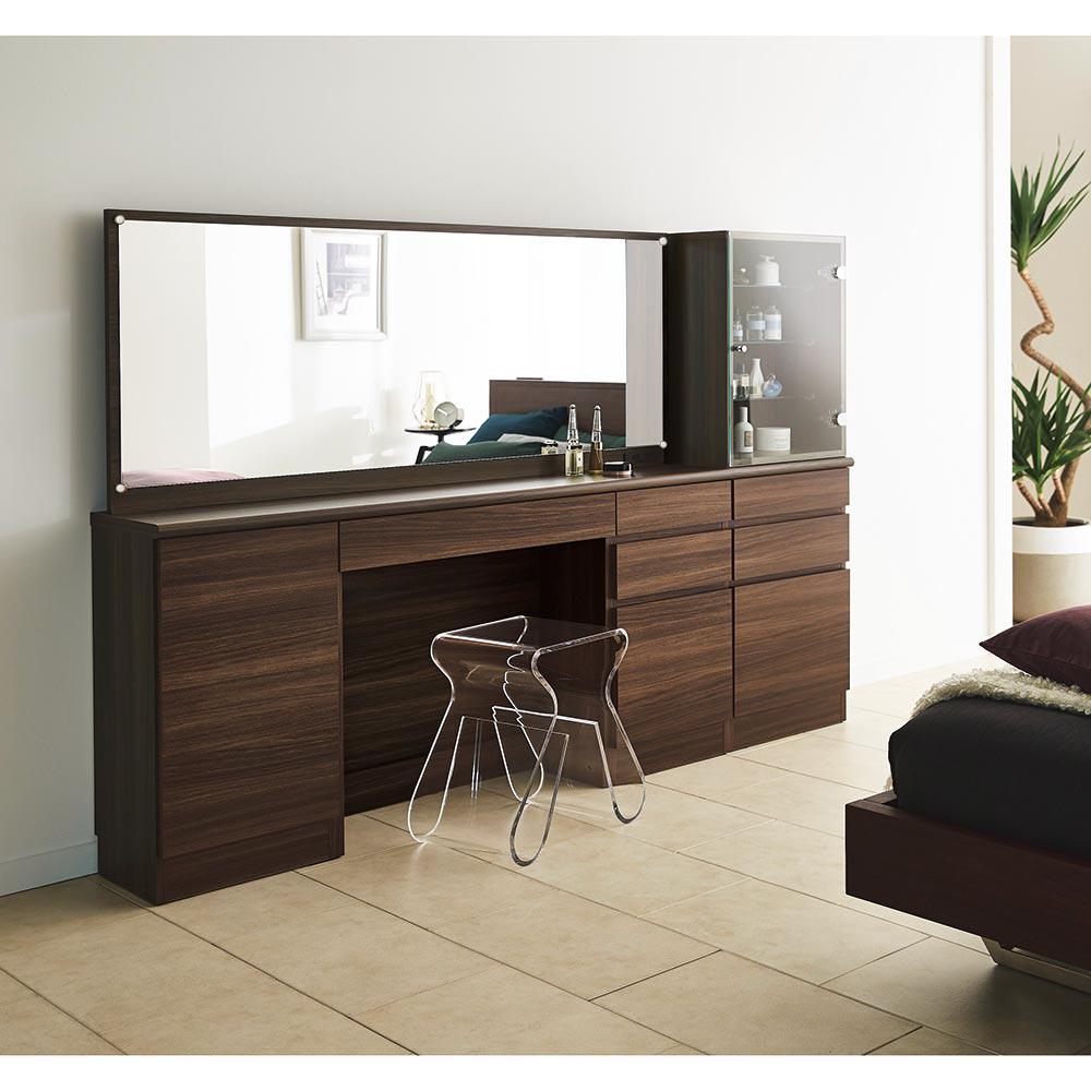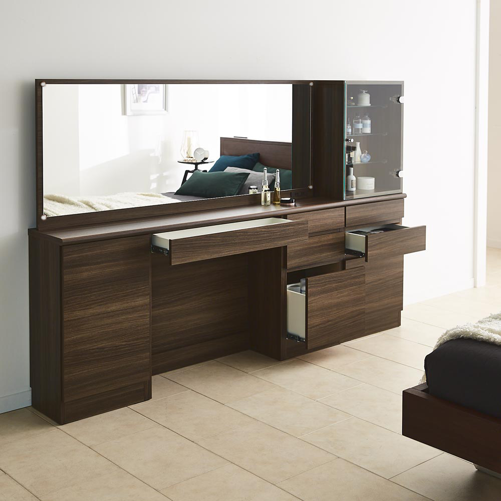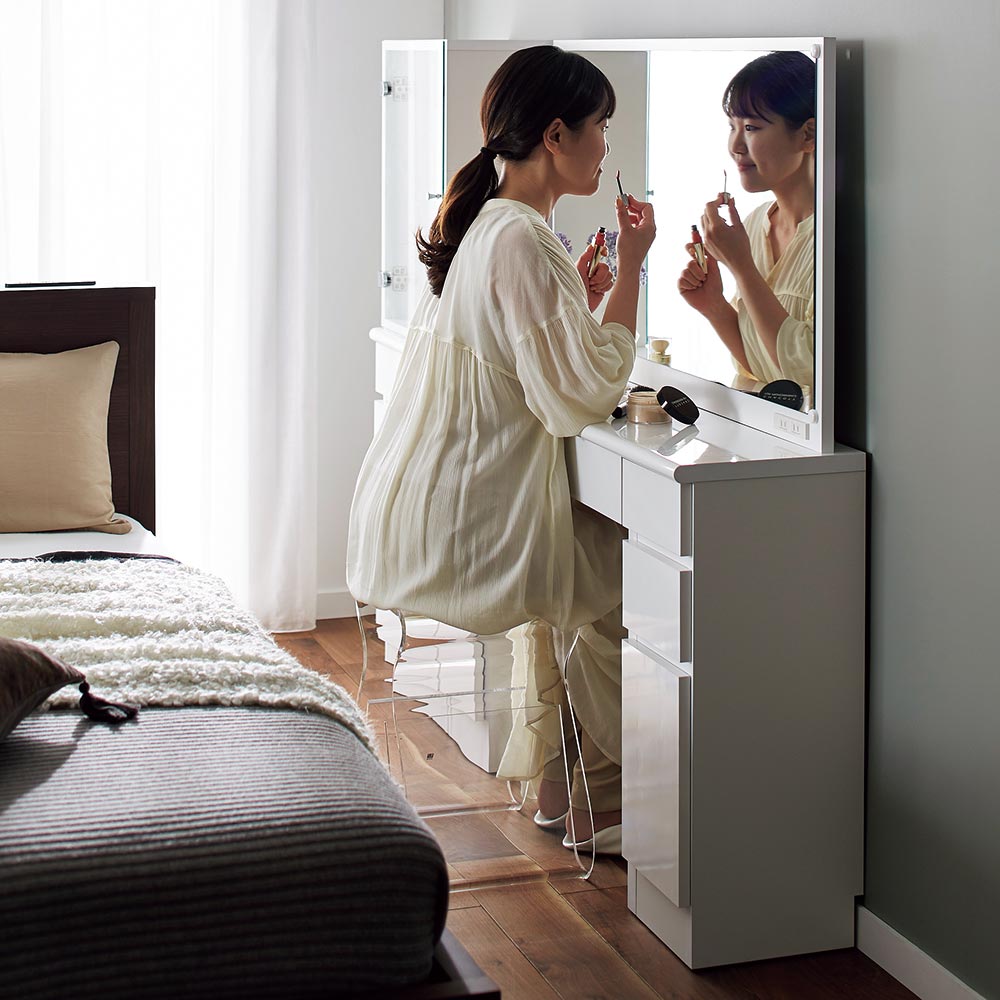 奥行き30cmとスリムでも収納力をしっかり持たせたドレッサーシリーズ。奥行きが浅いことで鏡が顔に近くなり、メイクもしやすくなりました。