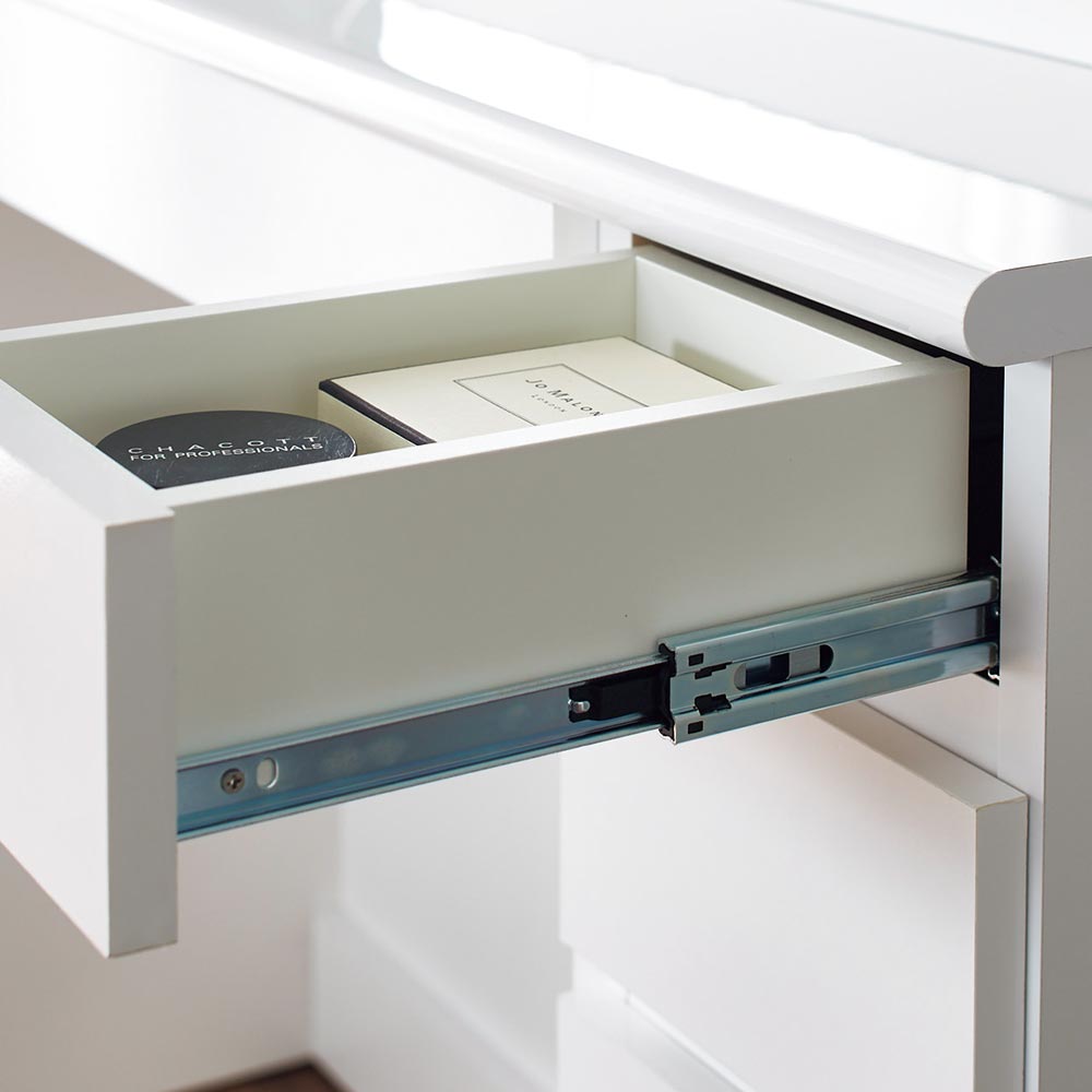 ■引き出しはフルスライドレールで開閉滑らか。奥までしっかり開くので中身の出し入れや整理整頓もスムーズ。