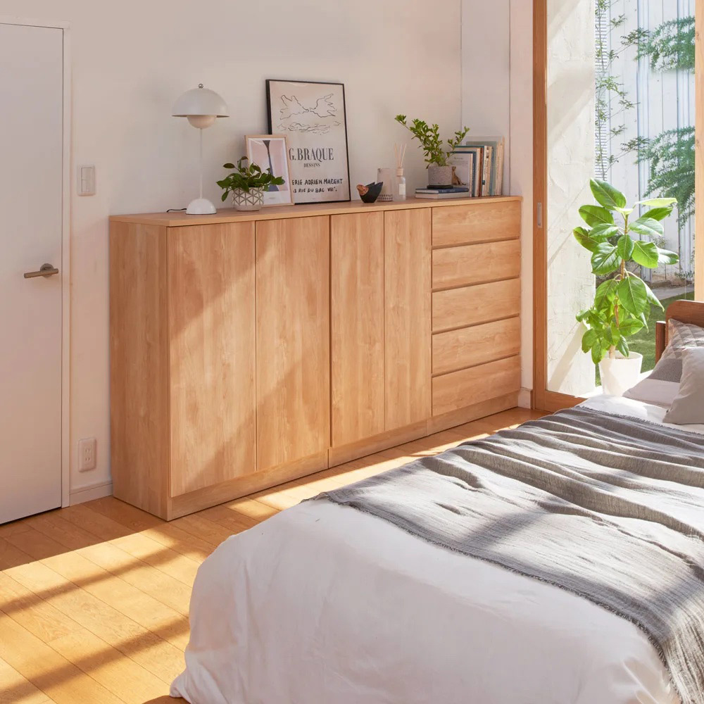 • 使用イメージ(ウ)ナチュラル キャビネットと別売りのチェストタイプを並べても、高さが揃うので統一感がありすっきり。 ※写真左から別売りの高さ109.5cm幅80cmタイプ、高さ109.5cm幅65cmタイプ、高さ109.5cm幅70cmチェストタイプです。
