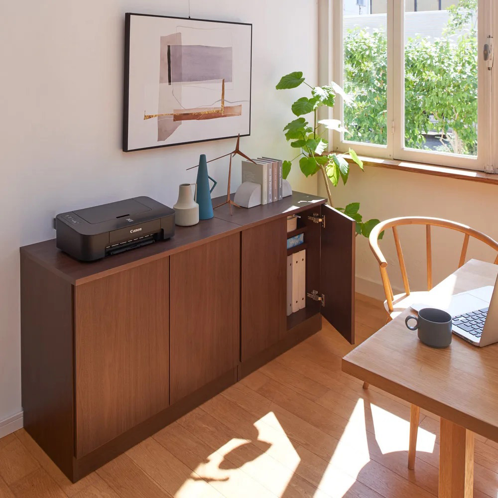 • 使用イメージ(ア)ブラウン 【ダイニングで】テレワークの書類入れにも。棚にA4ファイルが見やすく収まります。 ※写真左から別売りの高さ69.5cm幅80cmタイプ、高さ69.5cm幅65cmタイプです。
