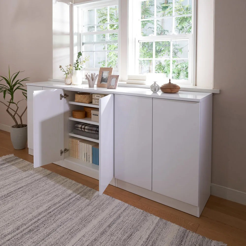• 使用イメージ(イ)ホワイト 【リビングで】高さ89.5cmタイプは窓下に置きやすい高さ。日用品のストックなどの収納にも。 ※写真左から別売りの高さ89.5cm幅60cmタイプ、高さ89.5cm幅70cmタイプ、高さ89.5cm幅75cmタイプです。