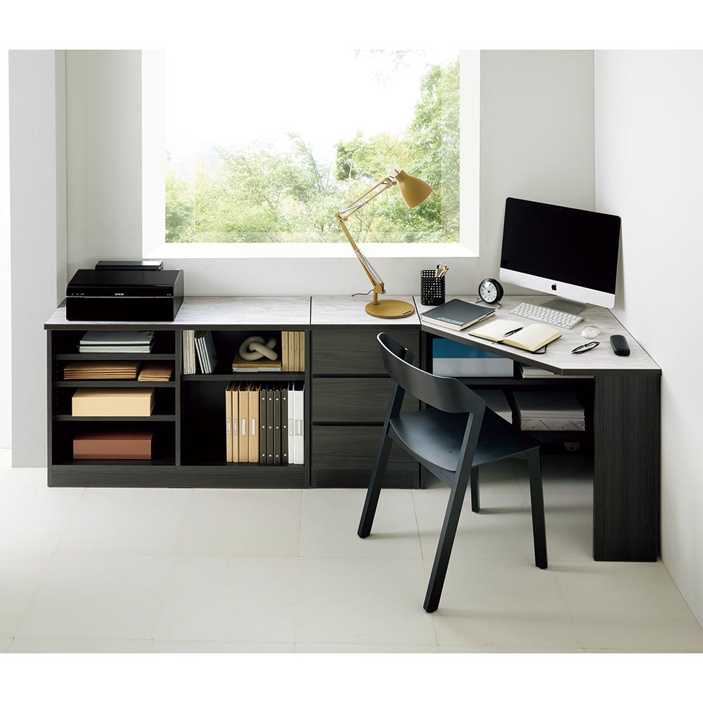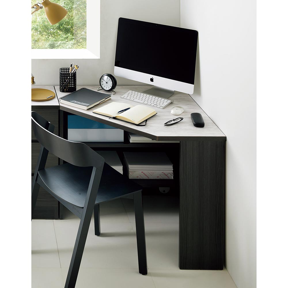 省スペースでもテレワークや日常作業に十分なスペースを確保できるコーナータイプのデスクシリーズ。ぴったりの幅にオーダーできるスリムな収納棚(別売り)をあわせて、仕事や趣味に没頭できるプライベート空間を実現できます。機能や収納も充実しており、大人から子どもまで、幅広い層にご使用いただけるデスクです。