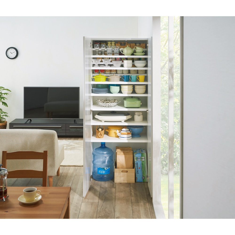 使用イメージ(ア)ホワイト 底板がなく段差レスなので重いものの出し入れもラク。固定棚から上は使いやすい段違い棚。 ※写真は本体幅75奥行56cm
